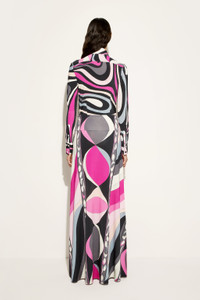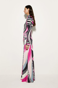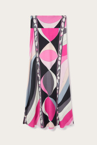 A mix of elegance and personality, this floor-length skirt is the perfect garment for those looking for a sophisticated yet fresh style. The straight cut and ribbed waist are combined with the maison's signature jersey, reinterpreted with lycra yarns for a unique sheen that enhances every movement. The print, inspired by the 1969 archive, is a work of art in motion: graphic and stylized fish on one side, irregular and dynamic stripes on the other, evoking multicolored ocean waves. Details such as abstract fish dancing along the edge complete a design that is as playful as it is refined. - To offer you a unique Pucci garment, we use an all-over print that makes the product unrepeatable. Therefore, the pattern print may vary from the one displayed in the photo. - Black and fuchsia - 95% viscose, 5% elastane - Lycra jersey for added sheen - Straight cut - Ribbed waist - Pesci print - Dry clean gently. - Made in Italy - The model is 177 cm tall and is wearing a 38 italian size. - ID: 5HJW115H787014