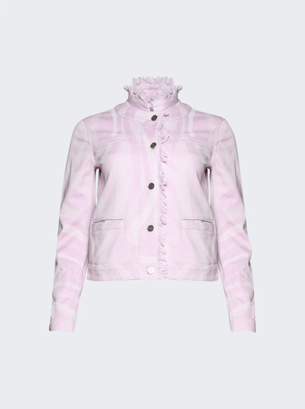 Details - Denim jacket with fringe detail - Marmo-effect laser work - Slightly stretchy Kane piece-dyed denim - The all-over print makes the product unrepeatable. Therefore, the pattern print may vary from the one displayed in the photo. - Material: 98% Cotton, 2% Elastane Vendor Color Code: Brand Style: 5UDB60-5U997 Designer/Brand: PUCCI