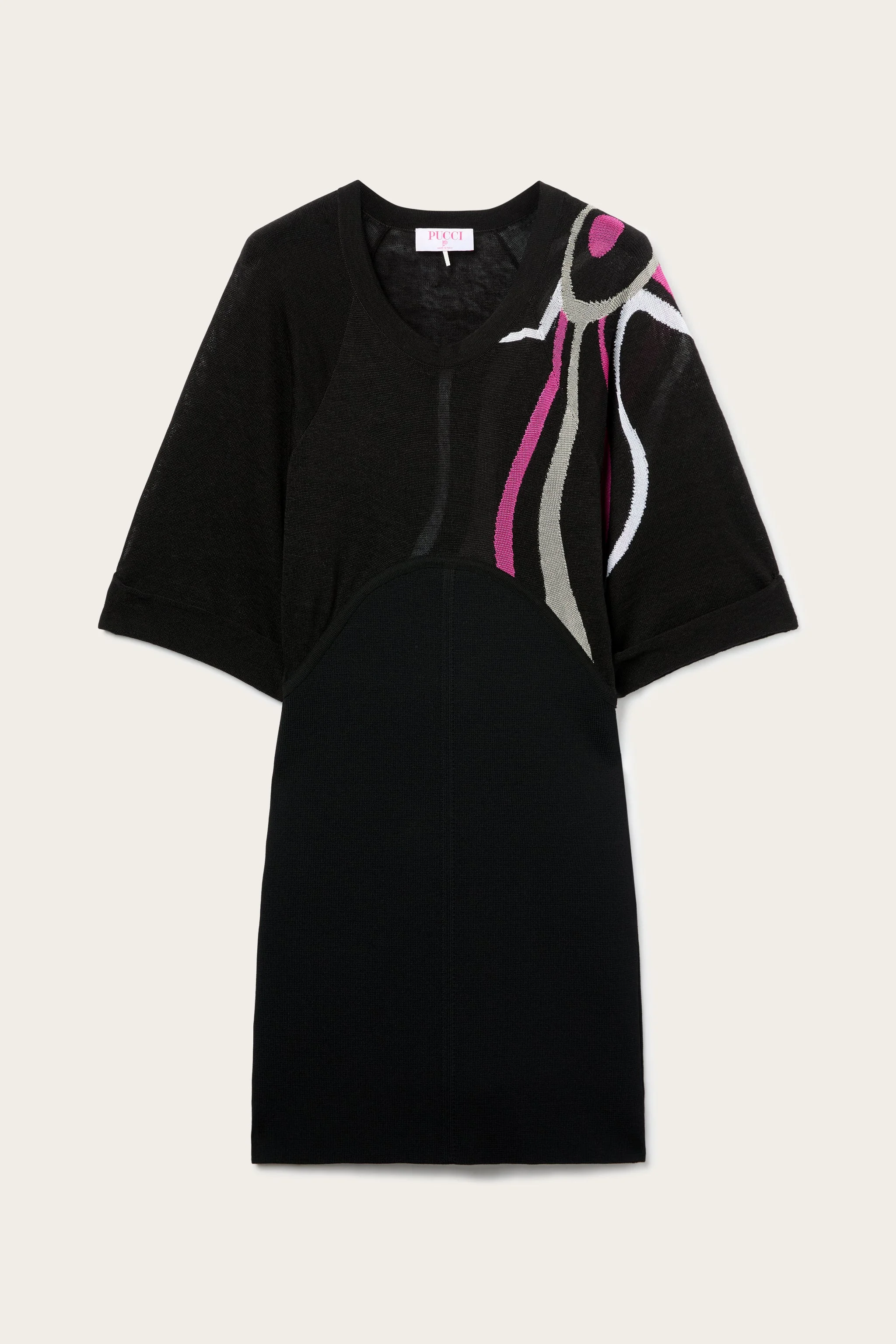 A garment that knows how to get noticed, perfect for those who like to combine femininity and modernity. This bodycon mini dress, with its fitted silhouette, wraps the body enhancing it in every detail. The T-shirt-style top adds a casual-chic touch, while the Marmo detail becomes the eye-catching element.Black, hibiscus and gray blend in a refined palette, ideal for elegant evenings or a special occasion. - Black, fuchsia and gray - Body: 55% Linen, 25% Cotton, 20% Viscose - Bottom: 68% Viscose, 32% Polyamide - Fitted bodycon silhouette - T-shirt style top - Marmo detailing - Gently dry clean. - Made in Italy - ID: 5HKG615H955A52 - The model is 178 cm tall and wears XS size.