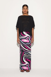 A garment that sculpts the silhouette with elegance and character. This high-waisted calf-length skirt is the perfect ally for sophisticated and contemporary looks. Thanks to the super stretch compact viscose jersey, it offers a snug fit and a slight compressive action that naturally enhances the figure. The Marmo print in black and fuchsia gives the design a lively touch, transforming it into a truly unique piece. Ideal for office outfits paired with a flowing blouse, or for a glamorous evening with a tight top and heels. - To offer you a unique Pucci garment, we use an all-over print that makes the product unrepeatable. Therefore, the pattern print may vary from the one displayed in the photo. - Black and fuchsia - 95% Viscose - 5% Elastane - High-waisted and tight-fitting - Calf-length - Light compression effect to enhance the figure - Marmo print - Delicate dry clean. - Made in Italy - ID: 5HJW055H766003 - The model is 175 cm tall and is wearing a 38 italian size.