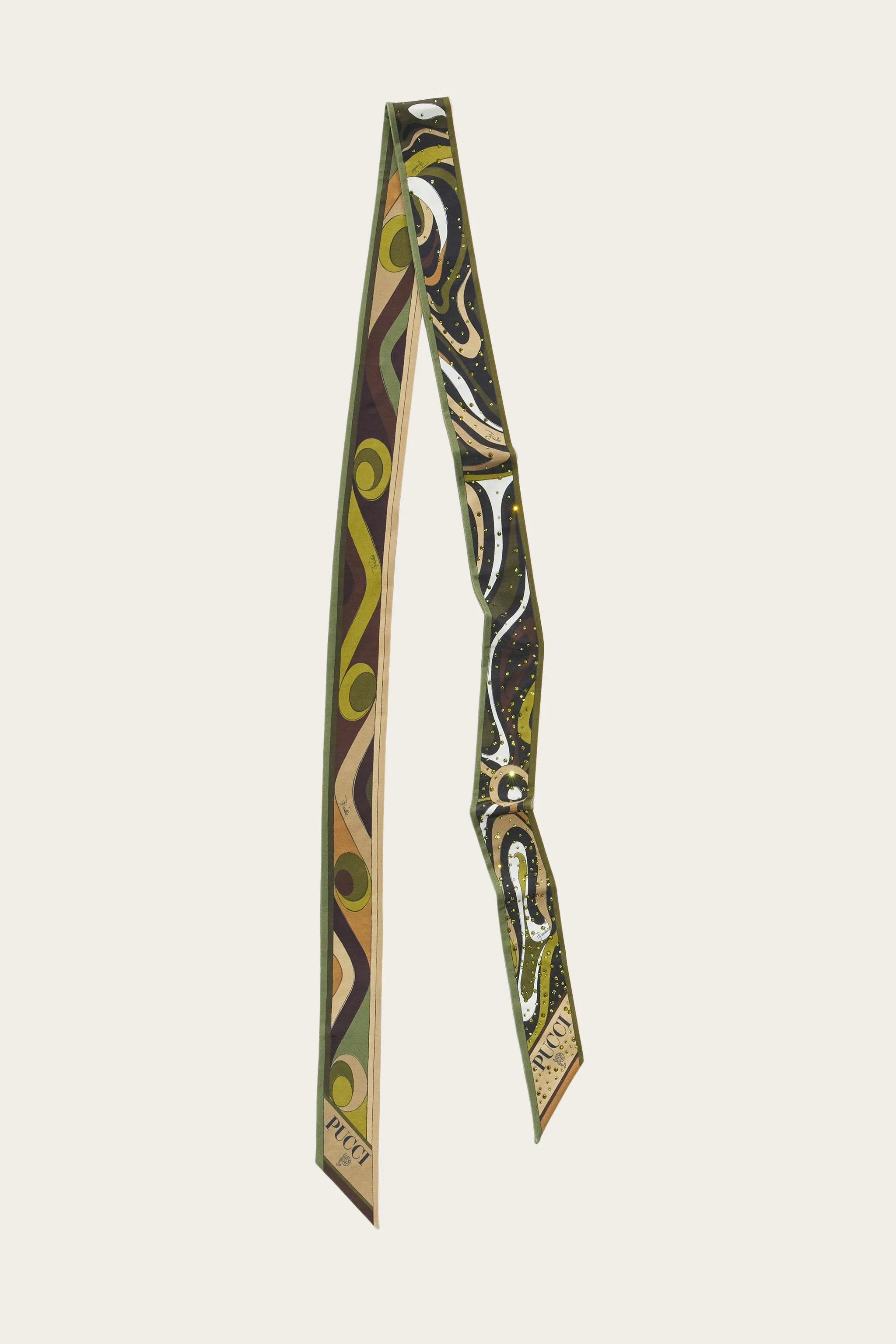 A versatile and sophisticated accessory, perfect for adding a glamorous touch to any outfit. This jersey satin band, featuring the iconic Marmo and Moire prints in shades of khaki, is a real style powerhouse.Thanks to the side embellished with heat-fixed rhinestones, this accessory can become the distinctive element for elegant hairstyles, a decorative belt or a unique detail to personalize bags and dresses. - Khaki - Marmo and Moire prints - Main materials: Viscose and Elastane - Glass details with heat-fixed rhinestones - Dimensions: 5x160 cm - Gently dry clean. - Made in Italy - ID: 5HGB255HC092