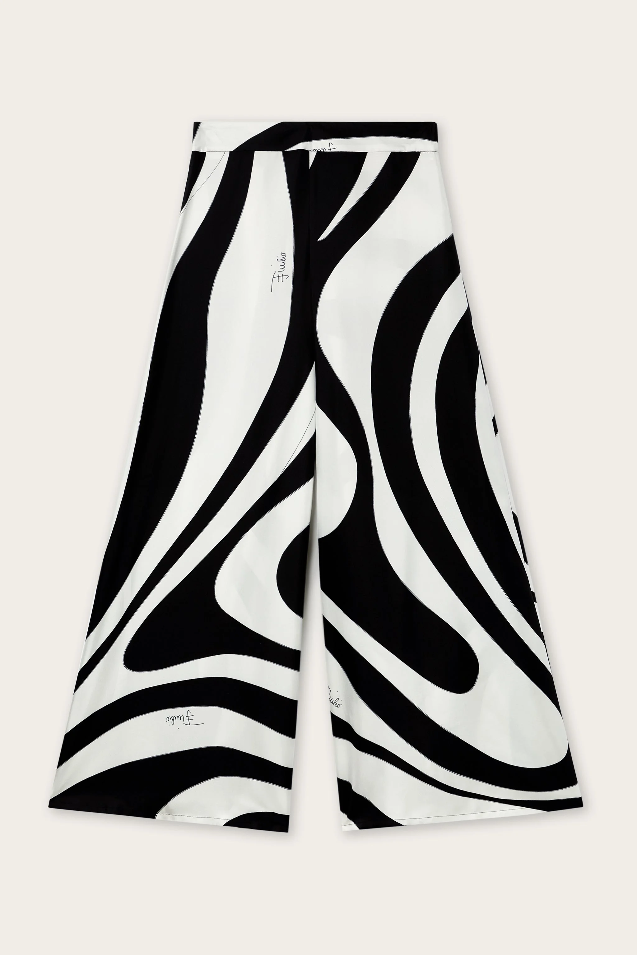 These wide-leg pants are designed to offer a comfortable and easy fit, ideal for accompanying you throughout the day.The Marmo print in black and white adds a touch of delicate movement, while the slightly stiff finish enhances the natural texture of silk, enhancing the uncompromising design. - To offer you a unique Pucci garment, we use an all-over print that makes the product unrepeatable. Therefore, the pattern print may vary from the one displayed in the photo. - Black and white - 100% silk - Wide leg and comfortable fit - Marmo print - Gently dry clean. - Made in Italy - The model is 176 cm tall and wears a 38 italian size. - ID: 5HRT015H861055