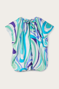 Fresh and playful, this short-sleeved top with wide sleeves stands out for its airy and light silhouette. The round neckline closes at the back with a tie, while the gathering at the bottom creates volume and movement. Made from lightweight cotton poplin with a soft finish, it is embellished with the Marmo print in green and lilac, an iconic Pucci pattern created in 1968 and inspired by the reflections of the sea in Capri's Blue Grotto. - To offer you a unique Pucci garment, we use an all-over print that makes the product unrepeatable. Therefore, the pattern print may vary from the one displayed in the photo. - Green and Lilac - 100% Cotton - Round neckline with tie at the back of the neck - Gathered hem - Soft finish - Delicate wash max 30°C - Made in Italy - ID: 5HRM175H761P50
