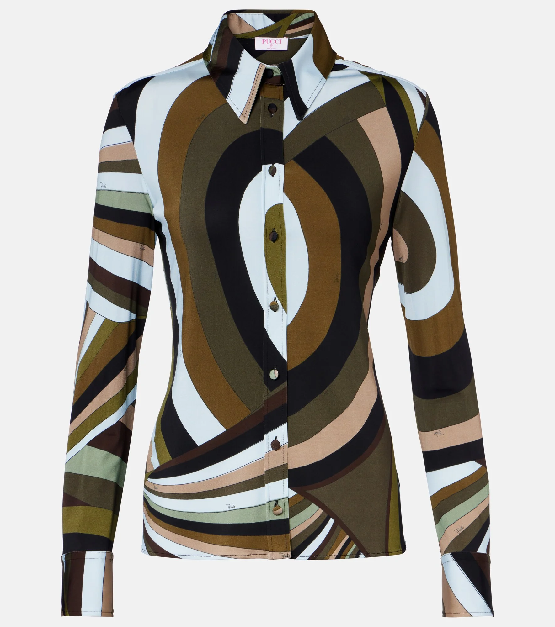 Pucci is best known for its assortment of iconic prints that captivate the eye. Made in Italy, this silk shirt features the brand's Marmo motif in a charming range of blue and green hues. Product Details - Material: 95% viscose, 5% elastane - Care instructions: dry clean - Made in Italy - Color: multicoloured - Designer color name: Khaki Blue - Collar: classic (Straight point) - Closure: buttoned placket - Cuff: two buttons - Item number: P01167372 Size & Fit - True to size - Fitted - Stretchy fabric - Falls to the hip - The model seen in the picture is 178cm-5'10" and wearing a size IT 40