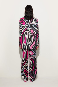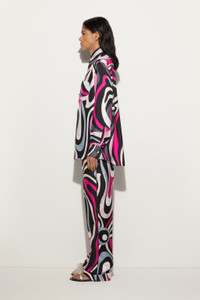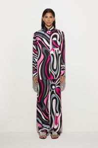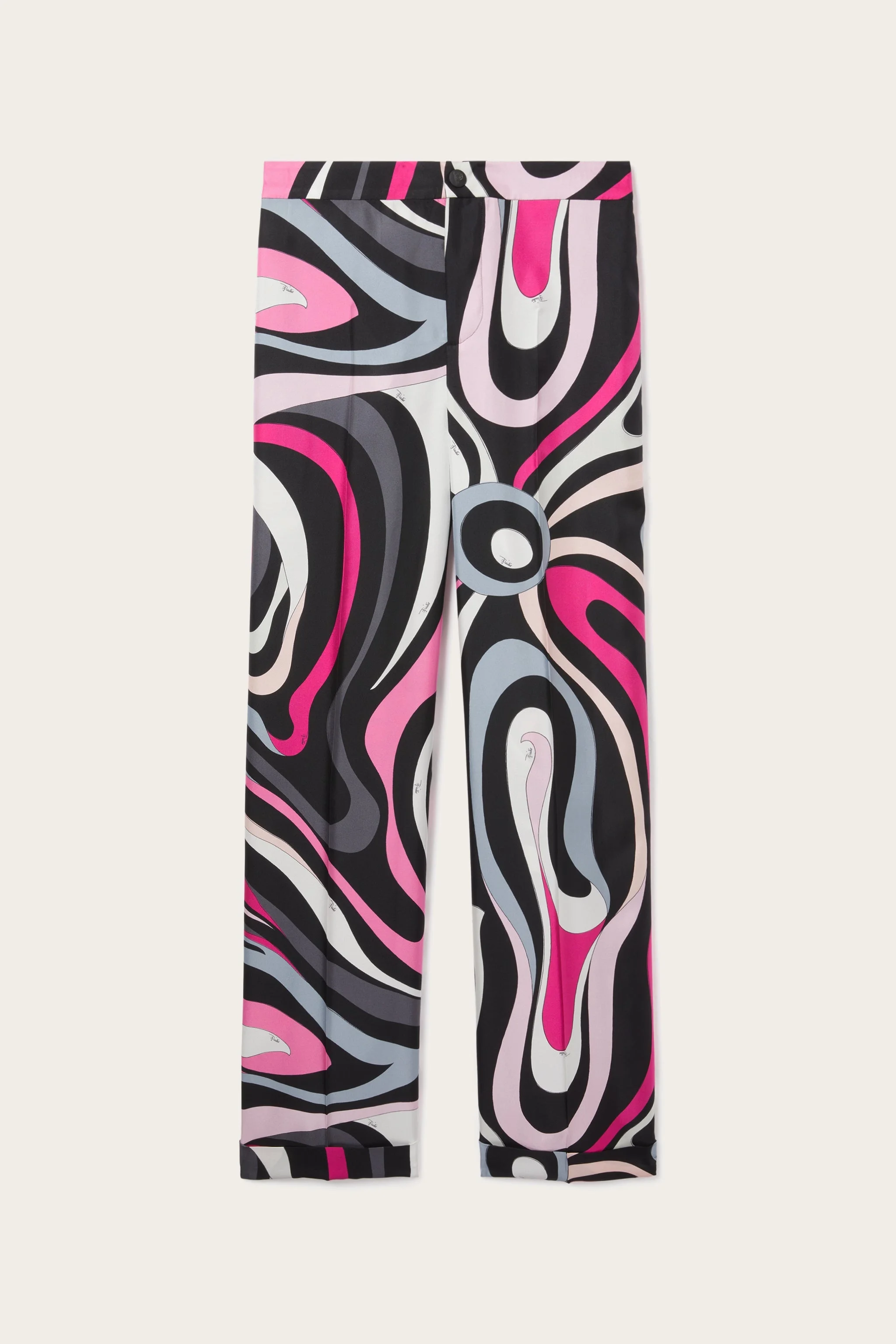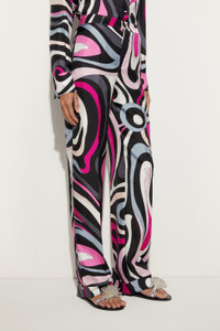 These straight pants are designed to offer a comfortable and easy fit, ideal for accompanying you at all times of the day.The Marmo print in black and fuchsia adds a touch of vibrancy and movement, while the slightly stiff finish enhances the natural texture of silk, enhancing the design without compromise. - To offer you a unique Pucci garment, we use an all-over print that makes the product unrepeatable. Therefore, the pattern print may vary from the one displayed in the photo. - Black and Fuchsia - 100% silk - Wide leg and comfortable fit - Marmo print - Gently dry clean. - Made in Italy - ID: 5HRT115H761003 - The model is 176 cm tall and wears a 38 italian size.