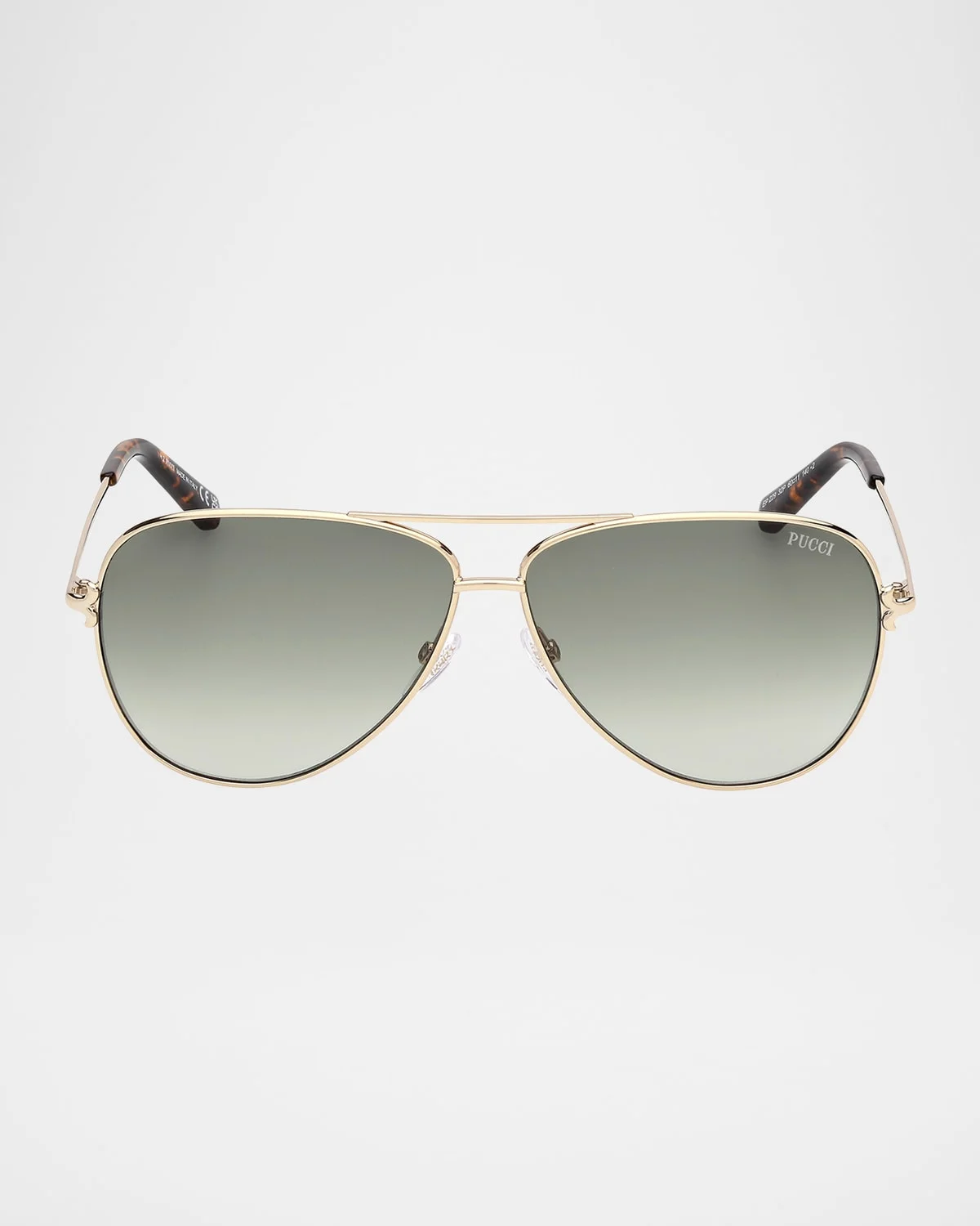 - Emilio Pucci aviator sunglasses in metal and acetate - Eye/bridge/temple (in mm): 60-11-140 - Gradient lenses - Adjustable nose pads - Thin, tapered arms - Capped ear pieces - Logo at lens - Metal/acetate - Spot clean - 100% UVA/UVB protection - Made in Italy - Proposition 65 warning for California residents