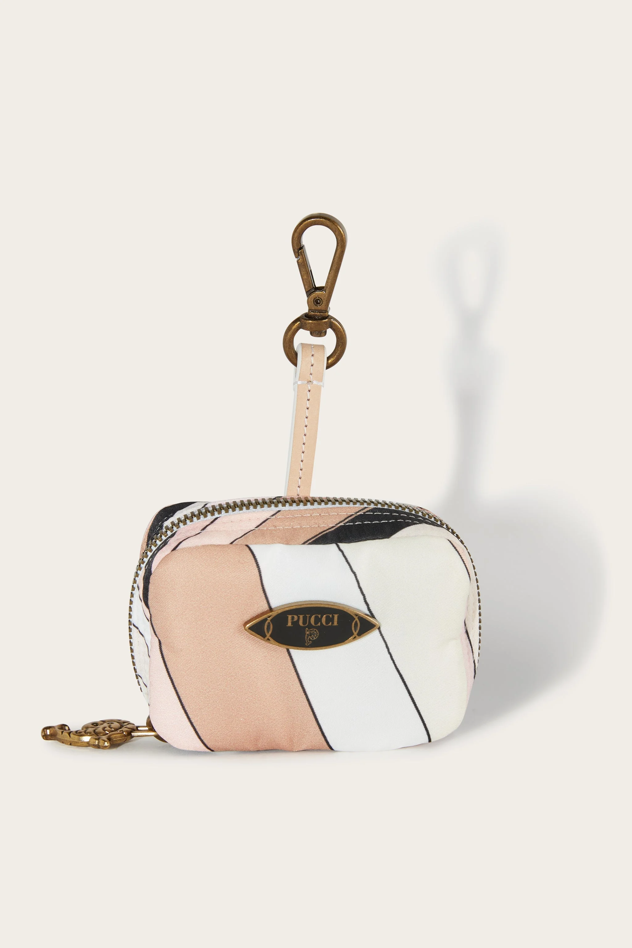 Small, practical and absolutely iconic! This mini pouch is the perfect accessory for those who don't sacrifice style, even in the details. The padded nylon protects your earbuds lightly, while the zipper and hook make it easy to attach to your bag or pant loops. A must-have for those who are always on the go!The details make all the difference: the enameled Pucci plaque and Pesci-shaped zipper puller add a playful touch, while the nude Iride print lends sophistication and uniqueness. Perfect to pair with the other Pucci accessories in the collection for a coordinated look. - To offer you a unique Pucci garment, we use an all-over print that makes the product unrepeatable. Therefore, the pattern print may vary from the one displayed in the photo. - Nude - Iride print - Outer: 100% Polyamide - Interior: 100% Polyamide - Nappa leather trim (var. 010 and 011) and Vacchetta leather (var. 007) - Enameled Pucci plaque - Fish-shaped zipper - Do not wash - Made in Italy - ID: 5HSK155H152007