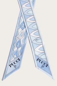 An elegant and versatile accessory, perfect for adding a touch of color to any look. This silk twill bandeau features pointed edges and a refined mix of prints. Lightweight and sophisticated, it can be worn in a variety of ways: as a headband, around the wrist, or tied to a bag for a distinctive detail that expresses the unmistakable Pucci style. - To offer you a unique Pucci garment, we use an all-over print that makes the product unrepeatable. Therefore, the pattern print may vary from the one displayed in the photo. - Pale Blue - Printed silk twill - Pointed edges - Dimensions: 5x120 cm - Dry clean only. - Made in Italy - ID: 6HGB216HC041