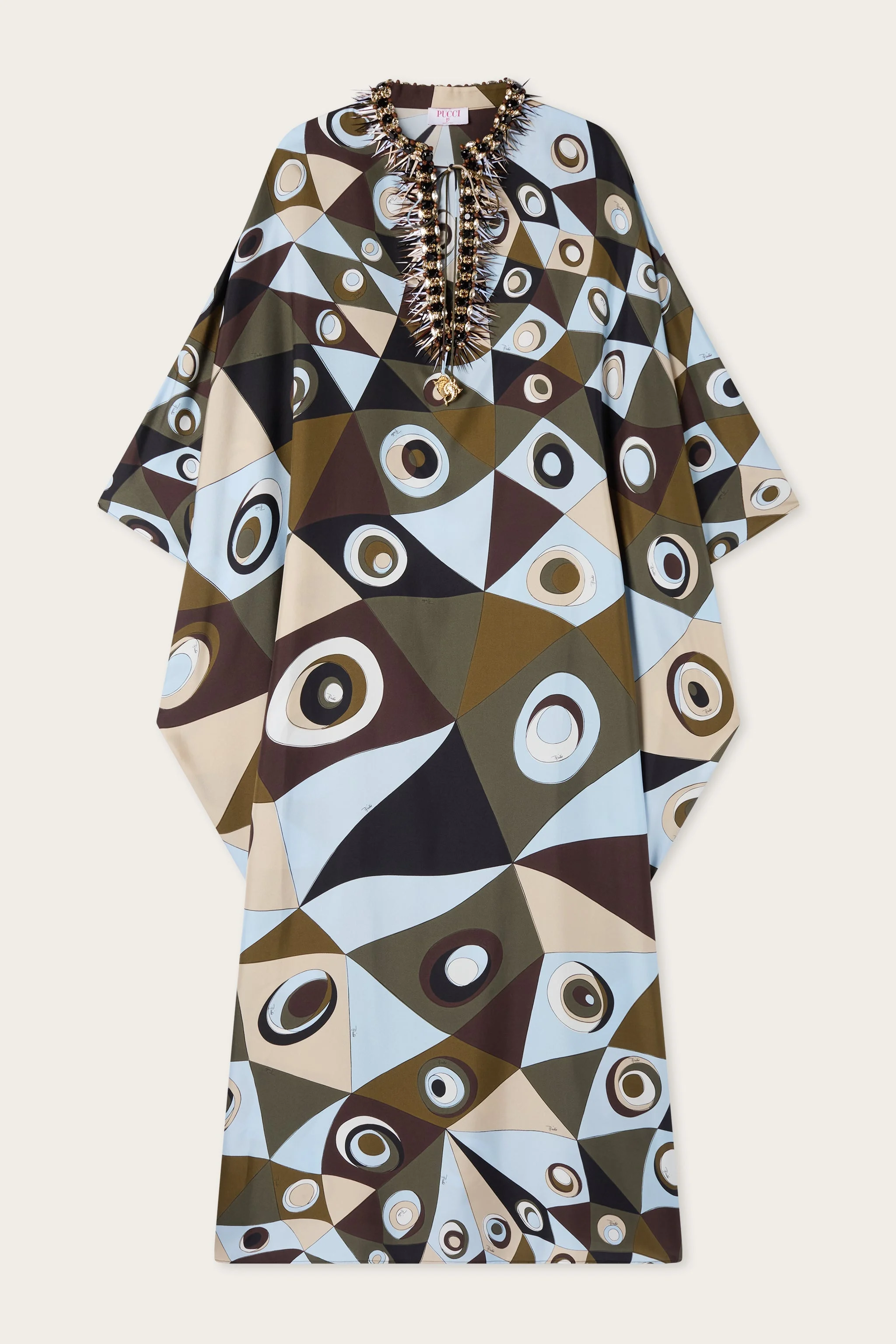A kaftan with a strong visual impact that combines fluidity and precious craftsmanship. Made of silk twill, it has a loose fit and long sleeves that move naturally with the wearer. The collar is embellished with elaborate embroidery, composed of stones set in three different shades, wooden elements, and pointed sequins, creating a striking interplay of textures and light. The Occhi print in shades of khaki and blue crosses the surface with a vibrant rhythm, enhancing the dialogue between graphics and decoration. - To offer you a unique Pucci garment, we use an all-over print that makes the product unrepeatable. Therefore, the pattern print may vary from the one displayed in the photo. - Khaki and Blue - 100% silk - Loose fit - Long sleeves - Embroidery on the collar with stones, wood, and sequins - Dry clean only - Made in Italy - ID: 6HRL806H721048