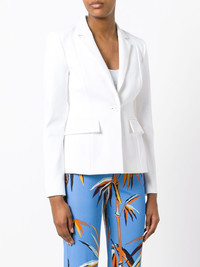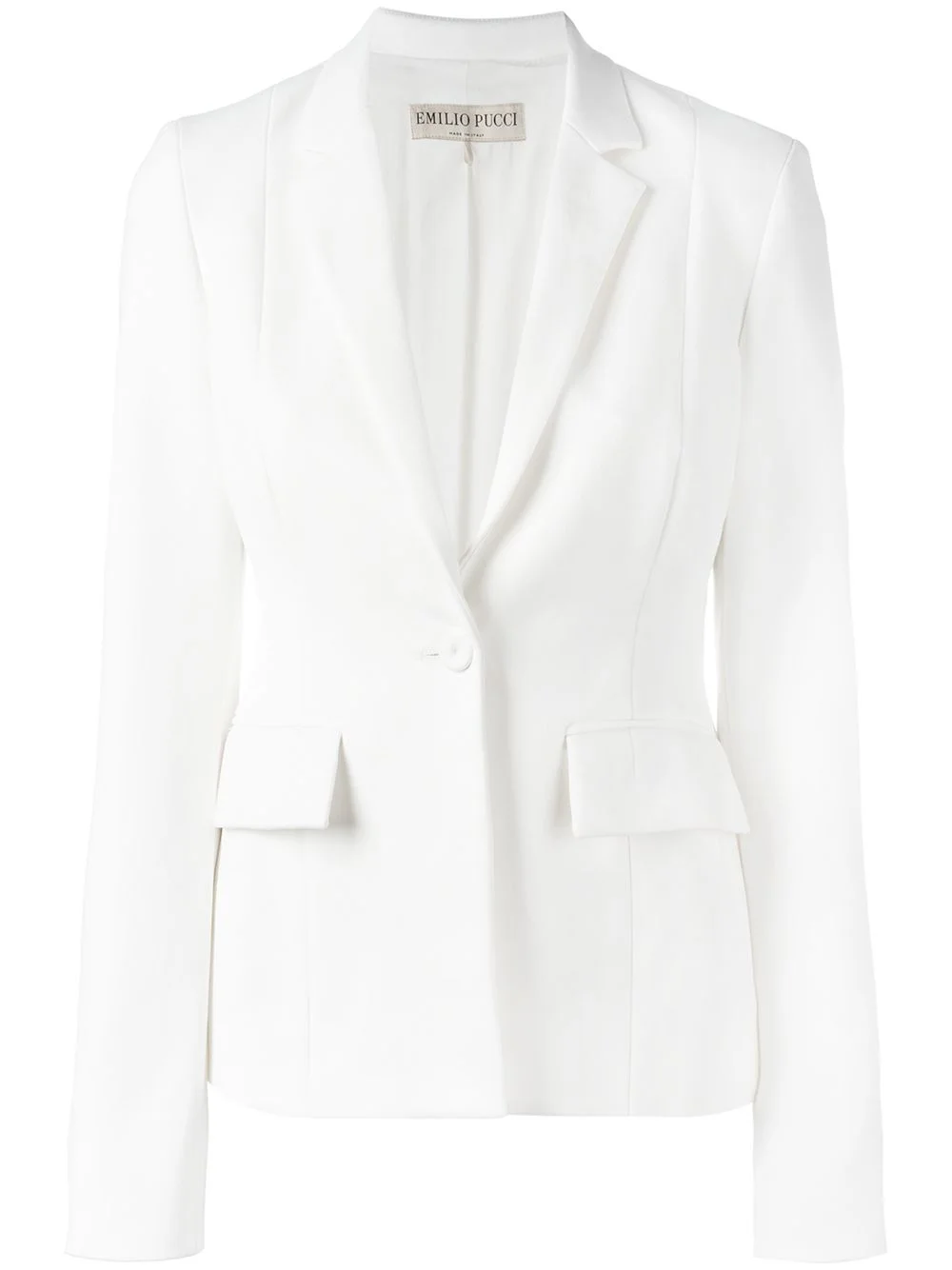 one button blazer White cotton, silk and linen blend one button blazer from Emilio Pucci. Made in Italy Composition Outer: Cotton 49%, Linen/Flax 35%, Nylon 11%, Spandex/Elastane 5% Lining: Silk 91%, Spandex/Elastane 9% SIZE & FIT Model measurements Height 5 ft 10 in(1.79 m) Bust/Chest 32.67 in(83 cm) Hips 33.46 in(85 cm) Waist 24.01 in(61 cm) Washing instructions Hand Wash