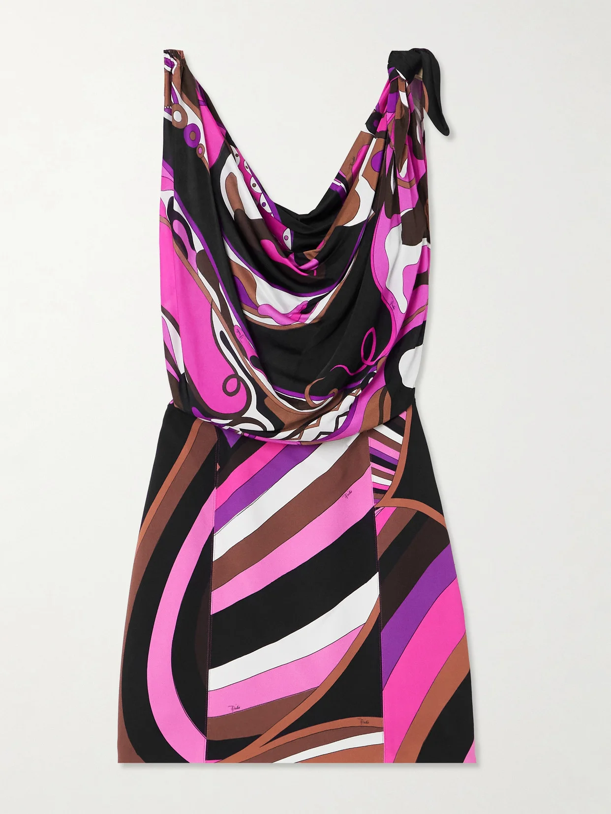 PUCCI's mini dress combines two of the brand's iconic prints to create maximum appeal - the draped satin bodice features the 'Orchidee' motif, and the fitted cady skirt is decorated with the 'Iride' version. It's knotted at one shoulder and looks chic with neutral accessories.