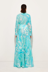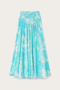 Lightness and movement come together in this straight-cut long skirt, designed to accompany every step with natural fluidity. The draped cotton fabric is soft to the touch and gives the garment an effortless elegance. The Orchidee print in turquoise tones adds a vibrant and refined touch, making this skirt a perfect balance between comfort and femininity. - To offer you a unique Pucci garment, we use an all-over print that makes the product unrepeatable. Therefore, the pattern print may vary from the one displayed in the photo. - Turquoise - 100% cotton - Straight cut - Flowing, lightweight hem - Wash at max 30°C - Made in Italy - ID: 5URW335U734019