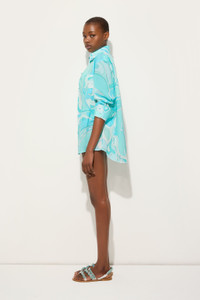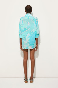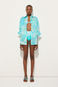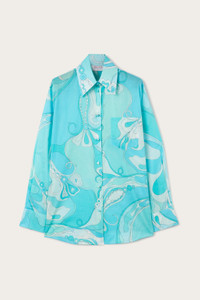 A minimalist silhouette that lets Pucci prints take center stage: this long-sleeved shirt pays homage to the natural grace of the iconic Orchidee print. Reinterpreted in vibrant turquoise, the pattern—first created in 1966—evokes Eastern aesthetics and the sinuous lines of nature, recalling tree bark and the elegance of stylized flowers. Made from lightweight cotton muslin, the fabric has a pleasantly soft feel and a naturally draping fit. The slim cut flatters the figure, while the regular shoulders and classic collar make it a versatile piece that can be worn with ease in both everyday and sophisticated settings. - To offer you a unique Pucci garment, we use an all-over print that makes the product unrepeatable. Therefore, the pattern print may vary from the one displayed in the photo. - Turquoise - 100% cotton - Classic collar - Long sleeves - Front button closure - Slim fit - Regular shoulders - Wash at max 30°C - Made in Italy - ID: 5URJ115U734019