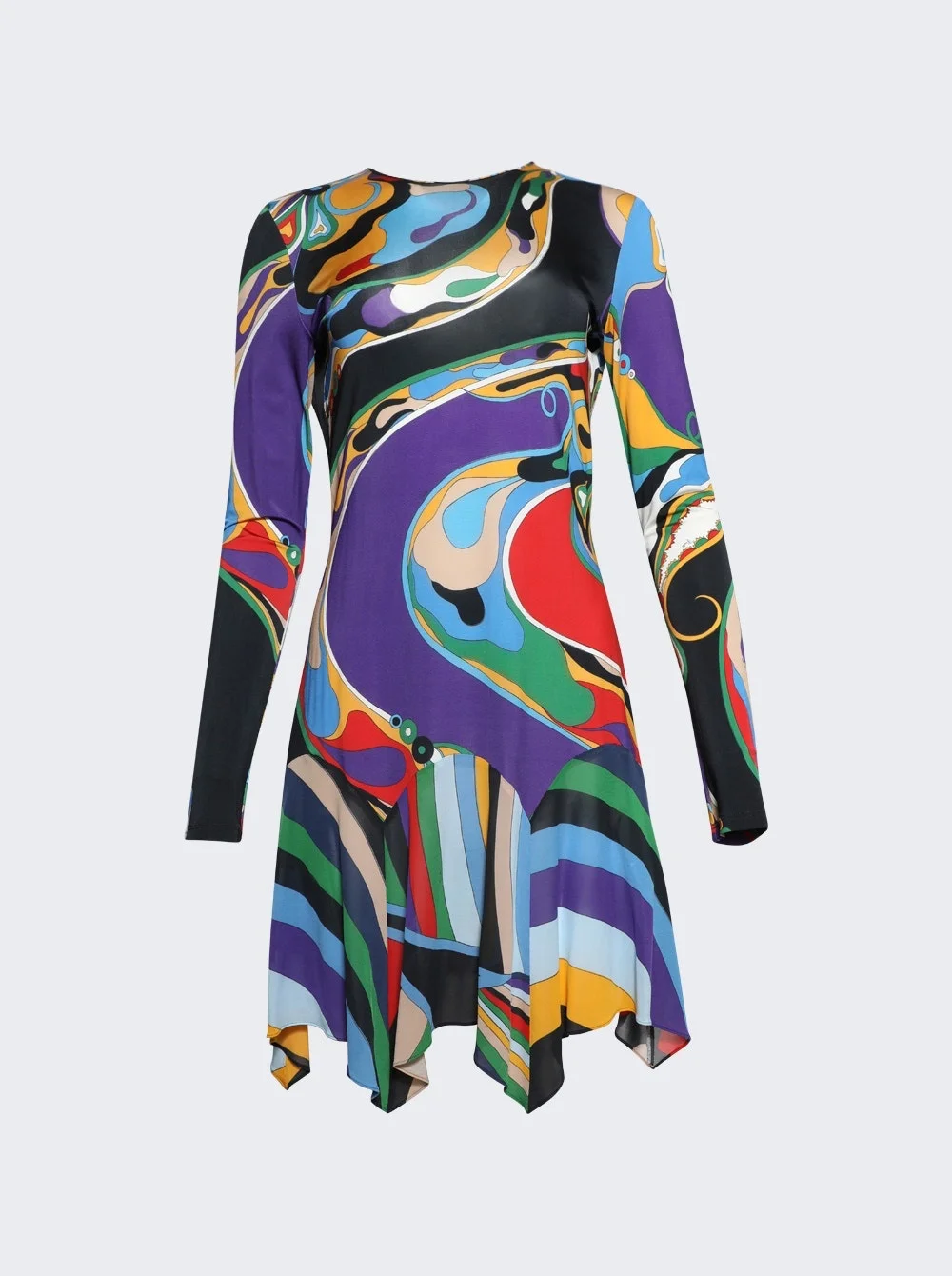 Details - Jersey mini - with a satin finish - Fitted bodice falls to a fluid handkerchief hem skirt - Orchidee-print - Long sleeves - Open back - Dropped waist - Rear button fastening - Kindly note that this product, as well as many other Pucci items, is made using an allover print and it falls differently on each garment, so the product you will receive may differ from one in the picture. - 95% rayon 5% elastane - Model is 5'9"/175cm and is wearing a size IT40 Brand Style: 4UJG45-4U737 Designer/Brand: PUCCI