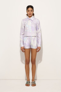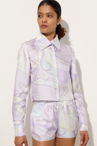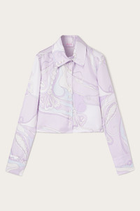 A nod to timeless elegance and refined femininity, this silk shirt revisits the poetic spirit of the Orchidee print, created in 1966 and inspired by Eastern aesthetics. The stylized lines of the flowers intertwine with organic movements that seem to envelop the body like sinuous branches, in a harmonious dance of shapes and colors. The design is classic and versatile, with a pointed collar, long sleeves, and button closure. The silk twill is finished to enhance its structure and highlight the natural brilliance of the material. The delicate lavender print adds a distinctive and iconic touch, ideal for elegantly interpreting every moment of the day. - To offer you a unique Pucci garment, we use an all-over print that makes the product unrepeatable. Therefore, the pattern print may vary from the one displayed in the photo. - Lavender - 100% Silk - Classic collar - Long sleeves - Front button closure - Regular fit - Standard length - Dry clean only - Made in Italy - ID: 5URJ155U731015