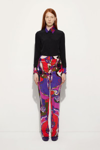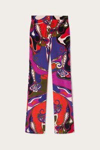 Clean lines and sophisticated textures define these straight cotton velvet pants, enveloped in a multicolor Orchidee print. The clean design with side pockets and button closure meets a soft, plush surface, enhancing femininity through comfort and quality materials. The print, a reinterpretation of a 1966 archive motif, blends oriental influences and stylized floral details, giving the garment an elegant and timeless charm. - To offer you a unique Pucci garment, we use an all-over print that makes the product unrepeatable. Therefore, the pattern print may vary from the one displayed in the photo. - Multicolor - Main fabric: 100% cotton – Lining: 67% acetate, 33% polyester - Straight cut - Button closure - Side pockets - Dry clean only - Made in Italy - ID: 5URT605U788017