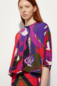 A flowing, romantic silhouette that pays homage to Pucci's timeless elegance. This blouse with a round neckline and wide cape-style line features adjustable ties at the waist and back of the neck for a personalized fit. The satin jersey enhances every movement with a delicate sheen, while the Orchidee print, inspired by oriental aesthetics and nature, dresses the garment in charming multicolored shades. - To offer you a unique Pucci garment, we use an all-over print that makes the product unrepeatable. Therefore, the pattern print may vary from the one displayed in the photo. - Multicolor - Satin jersey with shiny effect - 80% Polyamide, 20% Elastane - Orchidee all-over print - Round neckline with back tie - Cape silhouette - Ties at the waist for an adjustable fit - Delicate dry clean - Made in Italy - ID: 5UJM805U737017