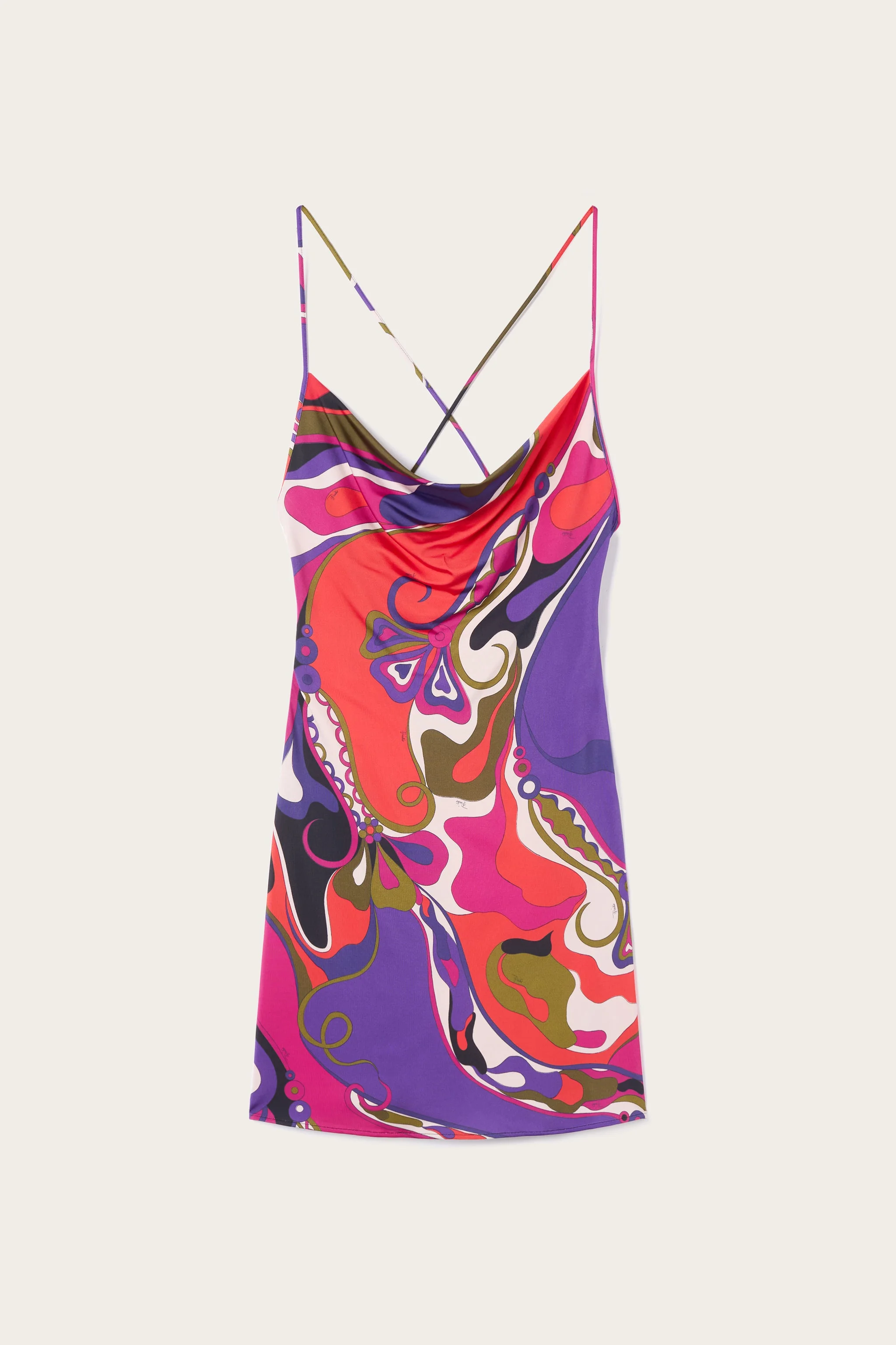 This short, form-fitting dress combines elegance and sensuality, thanks to its plunging neckline and thin straps. The stretch jersey, a reinterpretation of the iconic Pucci fabric, is made with twisted Lycra yarns for a luminous and sophisticated finish. The Orchidee print, in multicolor, expresses all the oriental refinement of the brand's archive with its stylized and sinuous floral motifs. - To offer you a unique Pucci garment, we use an all-over print that makes the product unrepeatable. Therefore, the pattern print may vary from the one displayed in the photo. - Multicolor - 83% Polyamide, 17% Elastane - Short, fitted style - Deep neckline - Thin straps - Shiny twisted Lycra fabric - Delicate wash at max 30°C - Made in Italy - ID: 5UJG365U737017