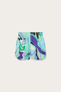 A blend of comfort and essential style. These boxy-fit shorts offer a relaxed, structured fit perfect for those who love versatile garments with distinctive character. The design is complemented by a ribbed waist and hem, providing a comfortable and defined fit.The Orchidee print in green and lilac adds a fresh and feminine touch, turning a casual garment into a style icon with timeless appeal. - To offer you a unique Pucci garment, we use an all-over print that makes the product unrepeatable. Therefore, the pattern print may vary from the one displayed in the photo. - Green and lilac - 100% Cotton - Squared fit - Ribbed waist and hem - Wash gently max 30°C. - Made in Italy. - ID: 5HRU305H739025 - The model is 177 cm tall and wears Italian size 38.