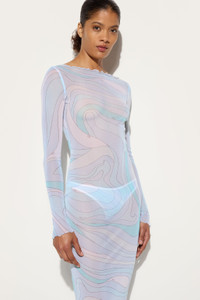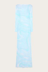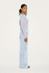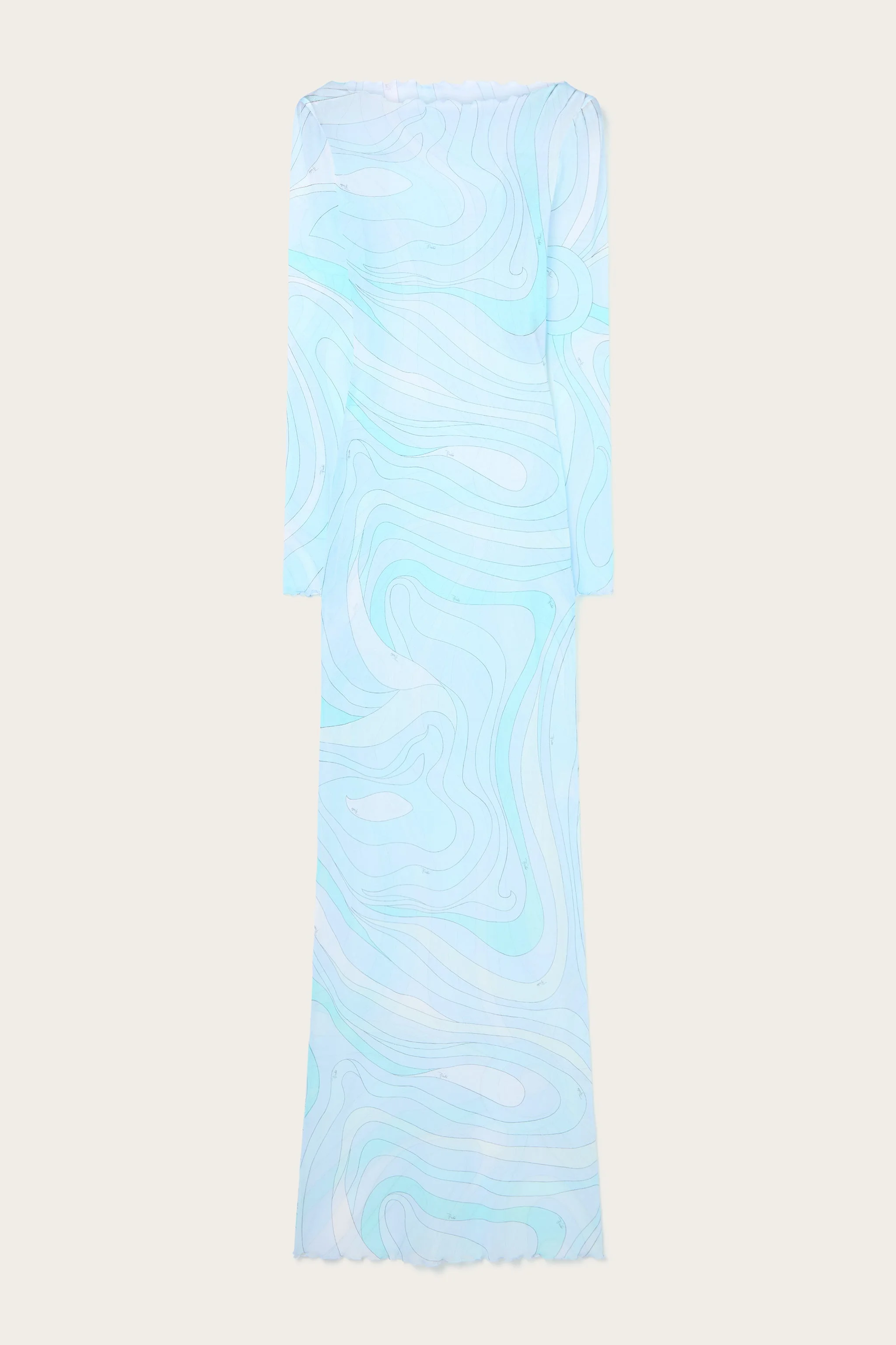 An exclusive selection of Pucci's iconic garments in an unprecedented version of the Marmo and Orchidee prints in the most delicate shades of aqua. A combination of craftsmanship, color and identity.A wearable work of art, this stretch tulle long dress captures the essence of Pucci DNA with its iconic Marmo print. The transparency of the lightweight fabric, as soft as a second skin, makes it perfect for a surprising and colorful layering effect. Designed for those who love to play with style, it is the ideal garment for exclusive vacations or events by the sea. - To offer you a unique Pucci garment, we use an all-over print that makes the product unrepeatable. Therefore, the pattern print may vary from the one displayed in the photo. - Aqua - 100% Polyamide - Long sleeves - Marmo print - Wash gently max 30°C - Made in Italy - ID: 5HJI355H769P42 - The model is 175 cm tall and wears a 38 italian size.