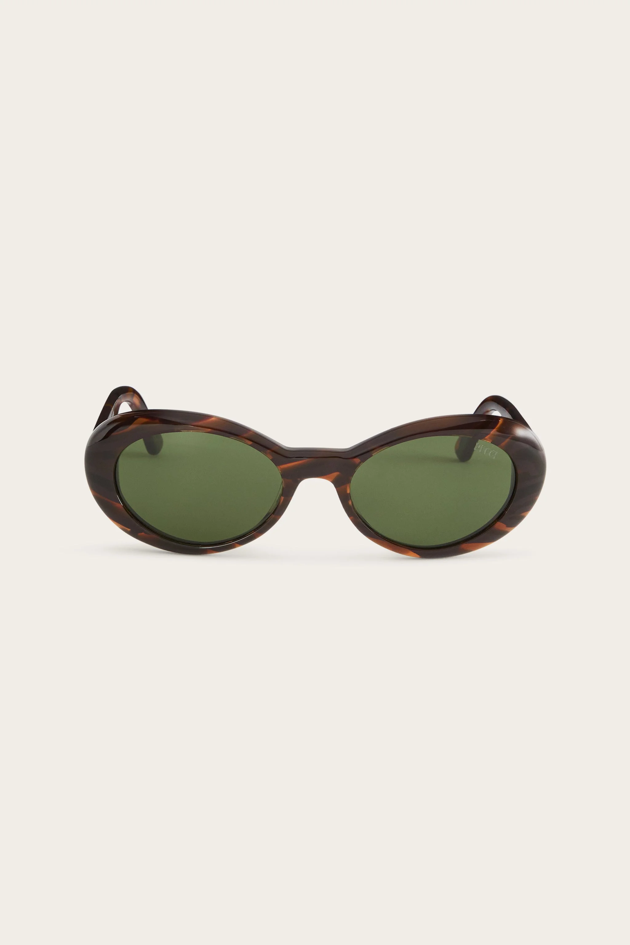 Refined elegance and graphic accents meet in this version of Pucci Fishtail glasses. The oval turtle acetate frame features a rounded, slightly convex line on the front, giving depth and volume to the design. The thin temples, embellished with the iconic Pucci logo followed by the lettering, discreetly balance the look, making it sophisticated and contemporary. Perfect for any occasion, they combine retro charm and modern style. - Havana and Green - Oval acetate frame with domed front - Thin temples with Pucci logo and lettering logo - Smoke lenses with 100% UV protection - ID: EP0234P005356N