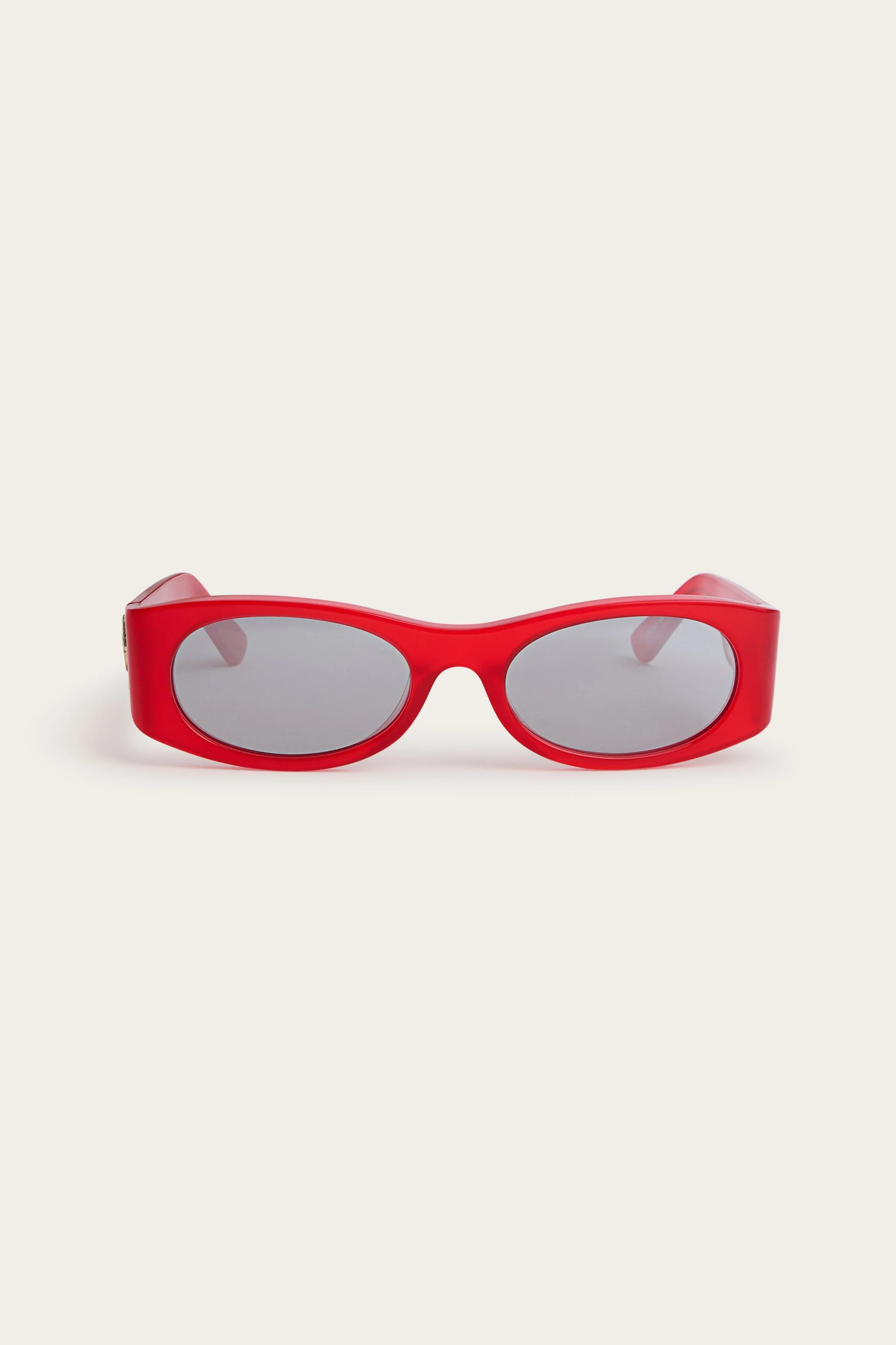 With bold character and a '90s spirit, these oval sunglasses stand out thanks to their energetic glossy red frame. The gold fish logo on the temple adds a distinctive and sparkling detail. Perfect for adding a pop accent to any look. - Shiny Red and Smoke Mirror - Acetate frame - Mirrored lenses - Gold fish logo - Size: 54 - Made in Italy - ID: EP0243P0054C66