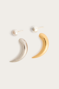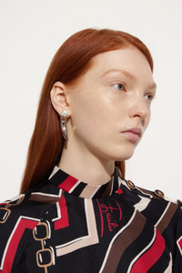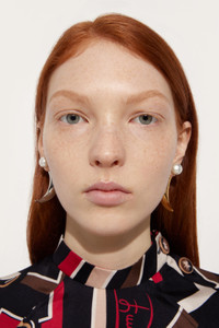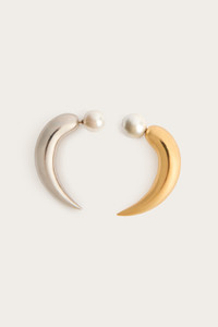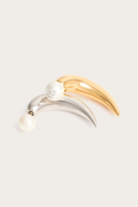 Bold lines and iconic references come together in these horn-shaped earrings, inspired by the piercing aesthetic. The asymmetrical design and mixed gold and palladium finishes lend a bold, contemporary character, perfect for those who like to stand out with unexpected details. The clasp is embellished with a Pucci logoed pearl, which adds a refined and recognizable touch, in an elegant contrast between “primitive” and sophisticated. - Gold and Palladium - Material: Brass - Piercing style horn design - Pucci logo bead closure - Not to be washed - Made in Italy - ID: 5UAL035U920N12