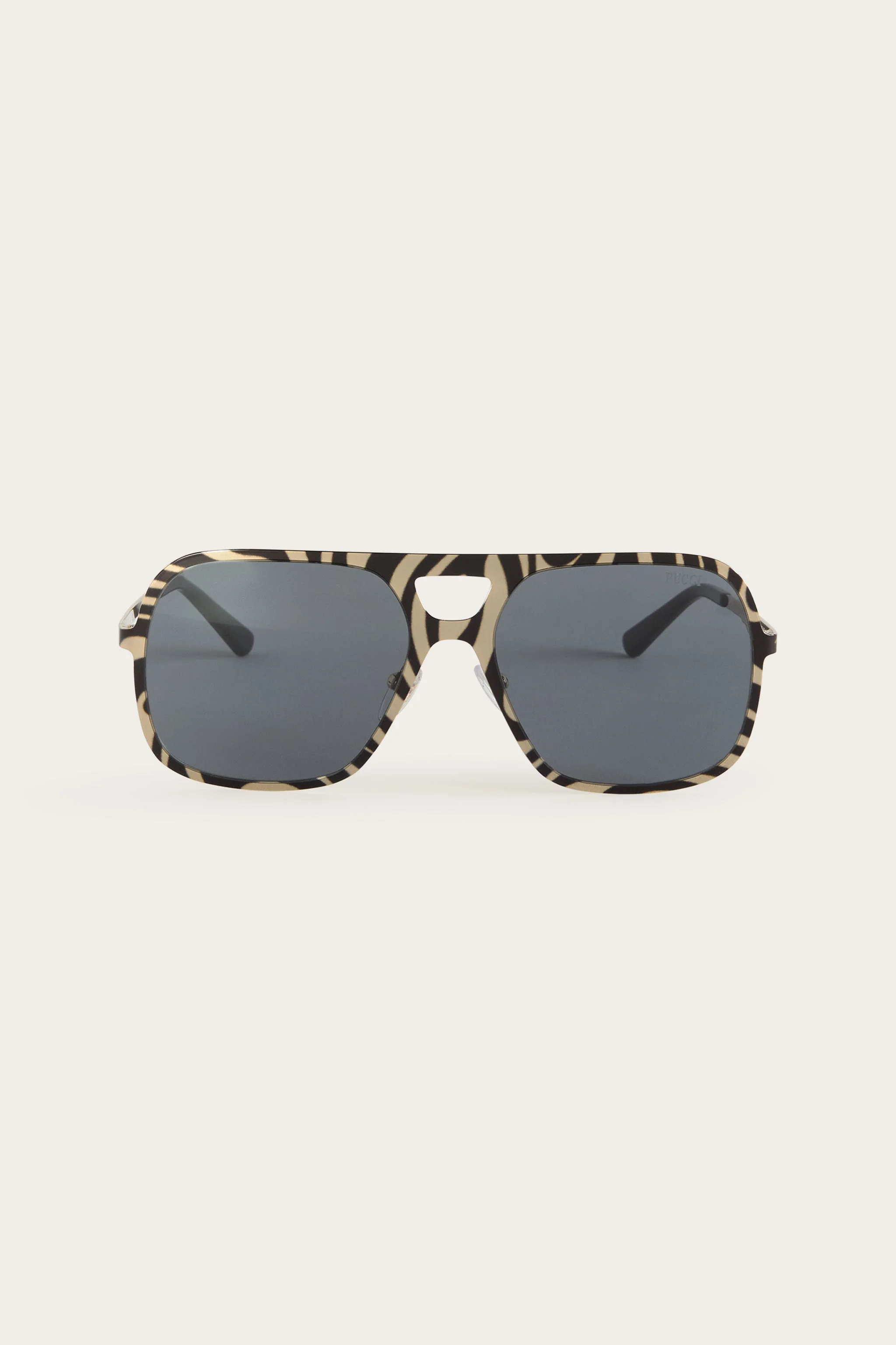 A great classic revisited according to the graphic dictates of Pucci. These aviator model sunglasses combine the energy of Pucci prints with a metal frame with a wrap-around front for a bold, contemporary effect.The brand's iconic motif lines the entire frame, transforming every detail into a unique expression of style. Smoked lenses complete the design with a sophisticated touch, perfect for those who love to stand out with elegance. - Black and smoke - Aviator model - Wrap-around front fully printed with Pucci pattern - Lenses with gradient effect - Shaped temples - Curved terminals - ID: EP0238M005605A