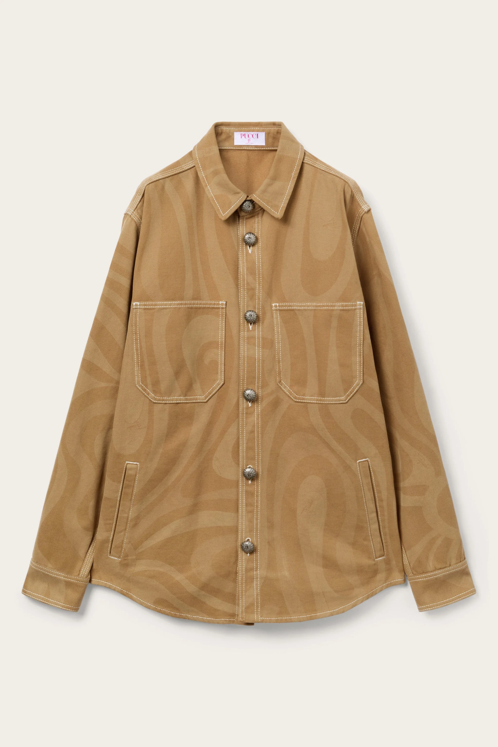 A classic revisited with the unique character of the Pucci world. This straight-cut jacket is a perfect blend of practicality and style, with its design reaching just below the waist and timeless details such as the chest pockets and flat collar.Enhanced by the taupe-colored Marmo wash, this garment gives a unique texture and a relaxed yet refined look. - To offer you a unique Pucci garment, we use an all-over print that makes the product unrepeatable. Therefore, the pattern print may vary from the one displayed in the photo. - Taupe - 100% cotton canvas - Straight cut - Length below the waist - Two chest pockets - Flat collar - Buttons along the opening - Marmo print - Gently wash max 30°C - Made in Italy - ID: 5HRC055H999A02 - The model is 178 cm tall and wears a 38 italian size.