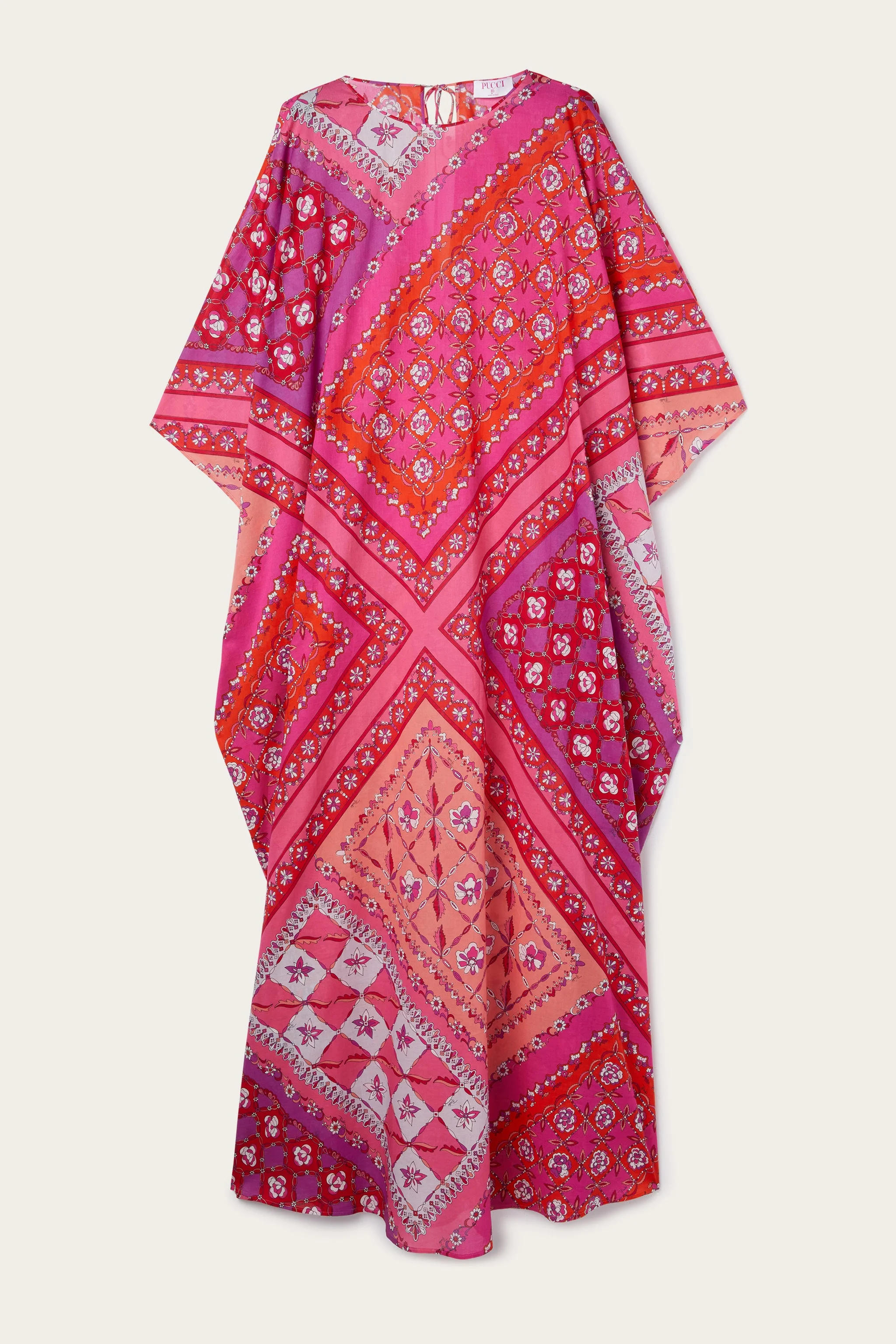An icon of lightness and sophistication, this long caftan embodies the casual elegance typical of Pucci style. Its loose-fitting design naturally envelops the body, offering comfort and freedom of movement. Made of 100% cotton, it is perfect for warmer days, thanks to its cool and airy texture. The coral and fuchsia Festa print gives a vibrant and sophisticated touch, celebrating the brand's energy and color dynamism. - To offer you a unique Pucci garment, we use an all-over print that makes the product unrepeatable. Therefore, the pattern print may vary from the one displayed in the photo. - Coral and fuchsia - 100% Cotton - Low and loose fit - Wash gently max 30°C. - Made in Italy. - ID: 5HRL455H764034 - Model is 177 cm tall and wears Italian size 38.