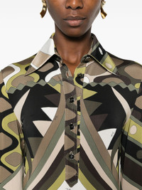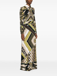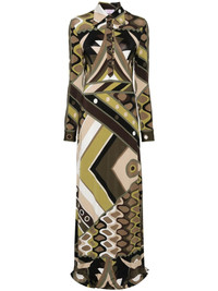 abstract-print maxi dress Highlights - Green/brown - Technical jersey - Abstract pattern print - Pointed collar - Long sleeves - Buttoned cuffs - Side slits - Long length - Straight hem - Front button placket Made in Italy Composition Viscose 95%, Elastane 5% SIZE & FIT Model measurements Height 5 ft 10 in(1.78 m) Bust/Chest 31.49 in(80 cm) Hips 37 in(94 cm) Waist 23.62 in(60 cm) Measurement CHEST 34.64 in(88 cm) SLEEVE LENGTH 24.8 in(63 cm) HIPS 33.07 in(84 cm) LENGTH 60.62 in(154 cm) WAIST 27.55 in(70 cm) FittingInformation Designed for a slim fit that sits just away from the body offering a close yet comfortable fit Made from a midweight stretch fabric, this piece offers elasticity and flexibility when worn This piece fits true to size – take your usual size