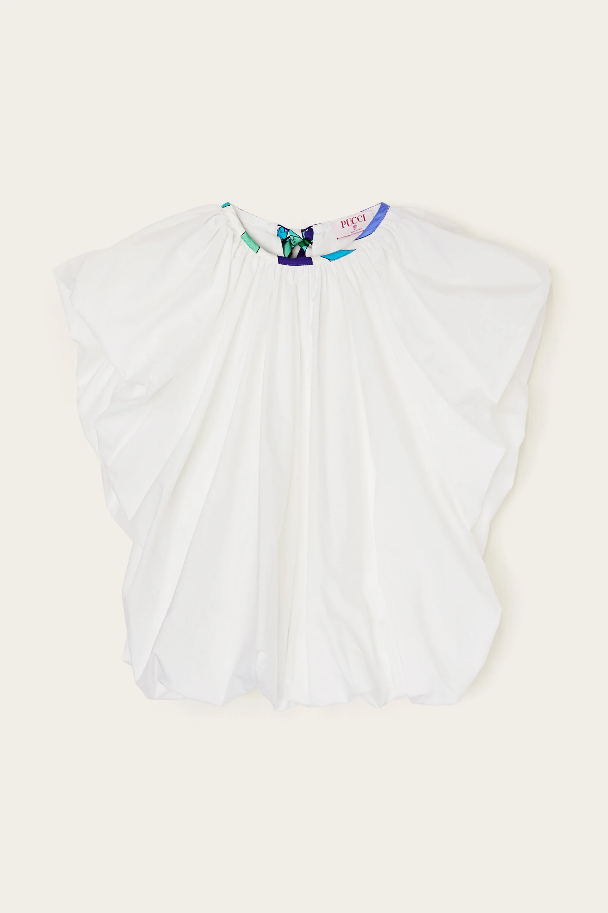 A top that celebrates lightness and femininity with a refined, modern design. Featuring a loose silhouette and ruffles along the hem, this sleeveless piece is perfect for adding movement and freshness to your looks. The round neckline and tie at the back of the neck add a touch of understated elegance, ideal for both casual and sophisticated outfits. Embellished with printed silk profiles, which give a colorful and sophisticated accent, it is the perfect garment to face the summer season with style and comfort. To offer you a unique Pucci garment, we use an all-over print that makes the product unrepeatable. Therefore, the pattern print may vary from the one displayed in the photo. - White - Lightweight cotton poplin with soft finish - Silk printed trim - Sleeveless - Round neckline with drawstring at back of neck - Curls along hem - Gently wash max 30°C - Made in Italy - ID: 5HRM185H602100