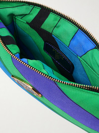 PUCCI's clutch is printed with the psychedelic 'Iride' motif - created in the '70s, it's still one of the label's most iconic patterns. It's made from padded shell in a beautiful blue palette and has a leather wrist strap and gold-tone logo plaque. Details & Care - Multicolored shell - Detachable wristlet strap - Zip fastening - Shell lining