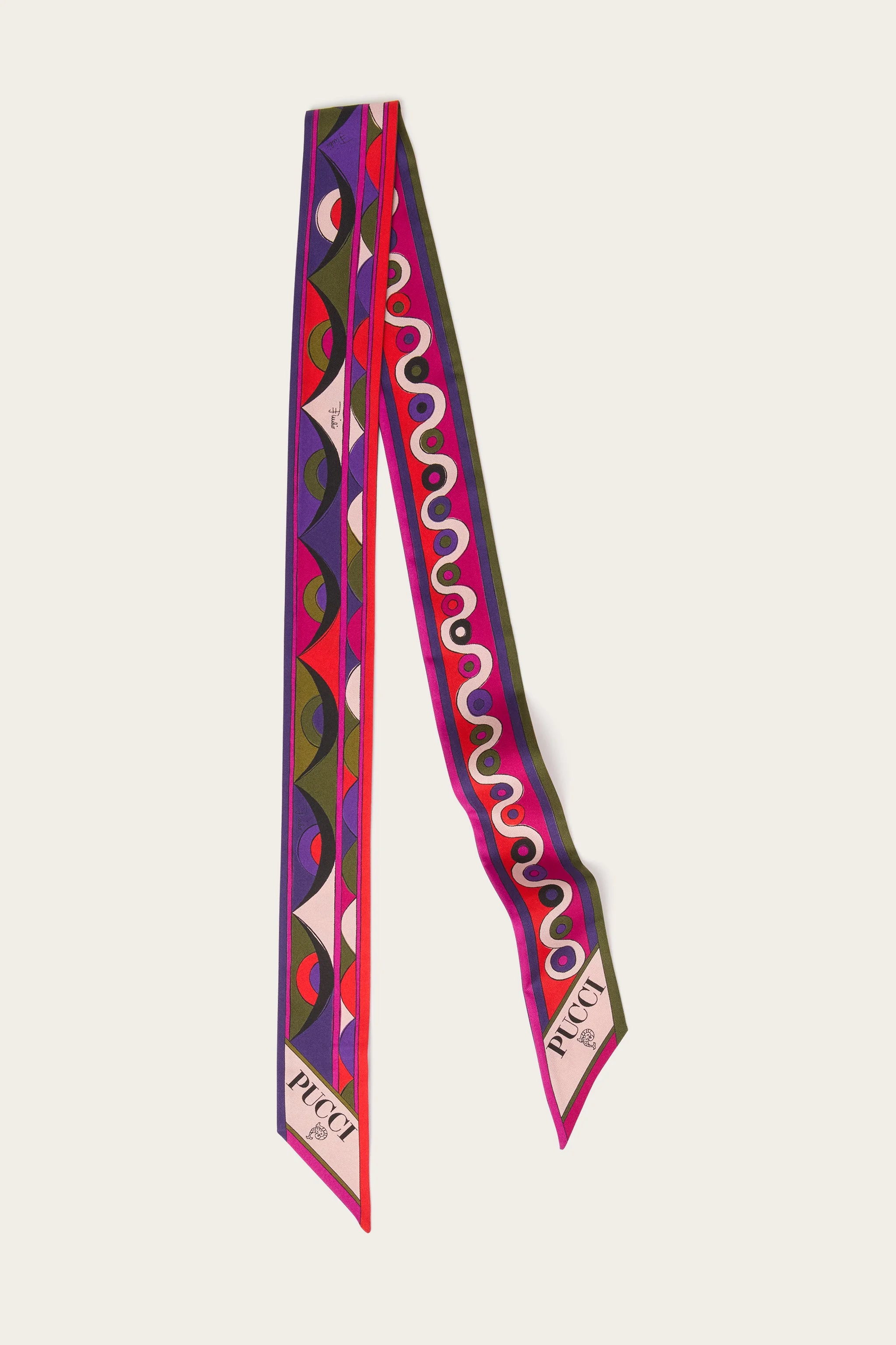 A versatile and refined accessory, perfect for adding a distinctive touch to any outfit. This silk twill scarf, featuring a unique combination of the Iride and Rombi prints, celebrates the art and energy of Pucci design. The multicolored print adds originality, making it perfect for adding a touch of glamour to any look, from casual to sophisticated. - Multicolor - Silk - Dimensions: 5x120 cm - Pointed edges - Mix of prints - Delicate dry clean. - Made in Italy - ID: 5UGB215UC042