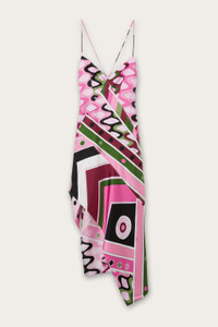 A flowing, luminous dress that showcases the enchantment of the Vivara print in pink and khaki. Its sinuous geometries, inspired by the island of Vivara in the Gulf of Naples and born from Emilio Pucci's aerial memory in 1965, intertwine in a play of waves and contrasts that flow along the silhouette. The thin straps and irregular hem accentuate the dynamic effect of the pure silk fabric, creating a movement that recalls water and its vibrations. A contemporary and sophisticated reinterpretation of the iconic motif, faithful to the spirit of the brand. - To offer you a unique Pucci garment, we use an all-over print that makes the product unrepeatable. Therefore, the pattern print may vary from the one displayed in the photo. - Pink and Khaki - 100% silk - Thin crossed straps - Irregular hem - Dry clean only - Made in Italy - ID: 5URI075U730P11