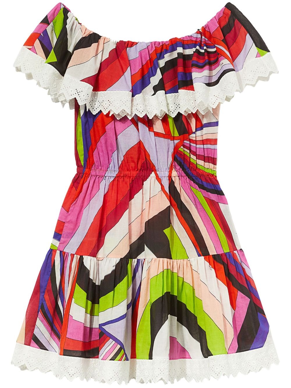 Iride-print off-shoulder cotton dress Highlights - Pink/multicolour - Cotton - Broderie anglaise - Off-shoulder - Short sleeves - Fitted waistline - Elasticated waistband - Tiered skirt - Above-knee length Made In Italy Composition Cotton 100%
