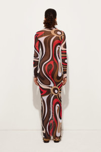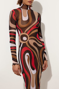 A second-skin effect garment that combines transparency and iconic Pucci motifs. This long-sleeved dress is made from lightweight, stretchy tulle that is soft to the touch and perfect for hugging the silhouette. The high neck adds a touch of modern elegance, while the gold and red Marmo print adds movement and character for a sensual yet refined look. - Gold and Red - Lightweight, stretchy tulle with a second-skin effect - 100% polyamide - Long sleeves - High neck - Fitted fit - Delicate wash max 30°C - Made in Italy - ID: 5UJI255U769006