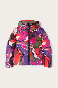 Warm, cozy, and stylish: this nylon down jacket combines functionality and distinctive graphics in perfect Pucci spirit. The padded design with hood and high collar offers optimal protection against the cold, while the front zip with iconic fish-shaped pull adds a playful detail. Made from nylon, the fabric is soft, durable, and water-repellent. The multicolored Orchidee print gives the garment a bold and unmistakable character. - To offer you a unique Pucci garment, we use an all-over print that makes the product unrepeatable. Therefore, the pattern print may vary from the one displayed in the photo. - Multicolor - Main fabric: 100% polyamide – Lining: 100% polyamide - Integrated hood and high collar - Zip closure with fish-shaped pull tab - Delicate dry clean - Made in Romania - ID: 5UYC025U787017