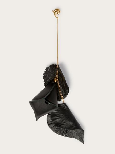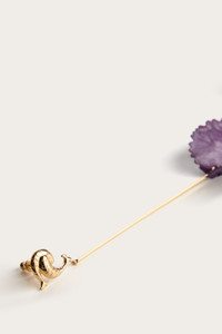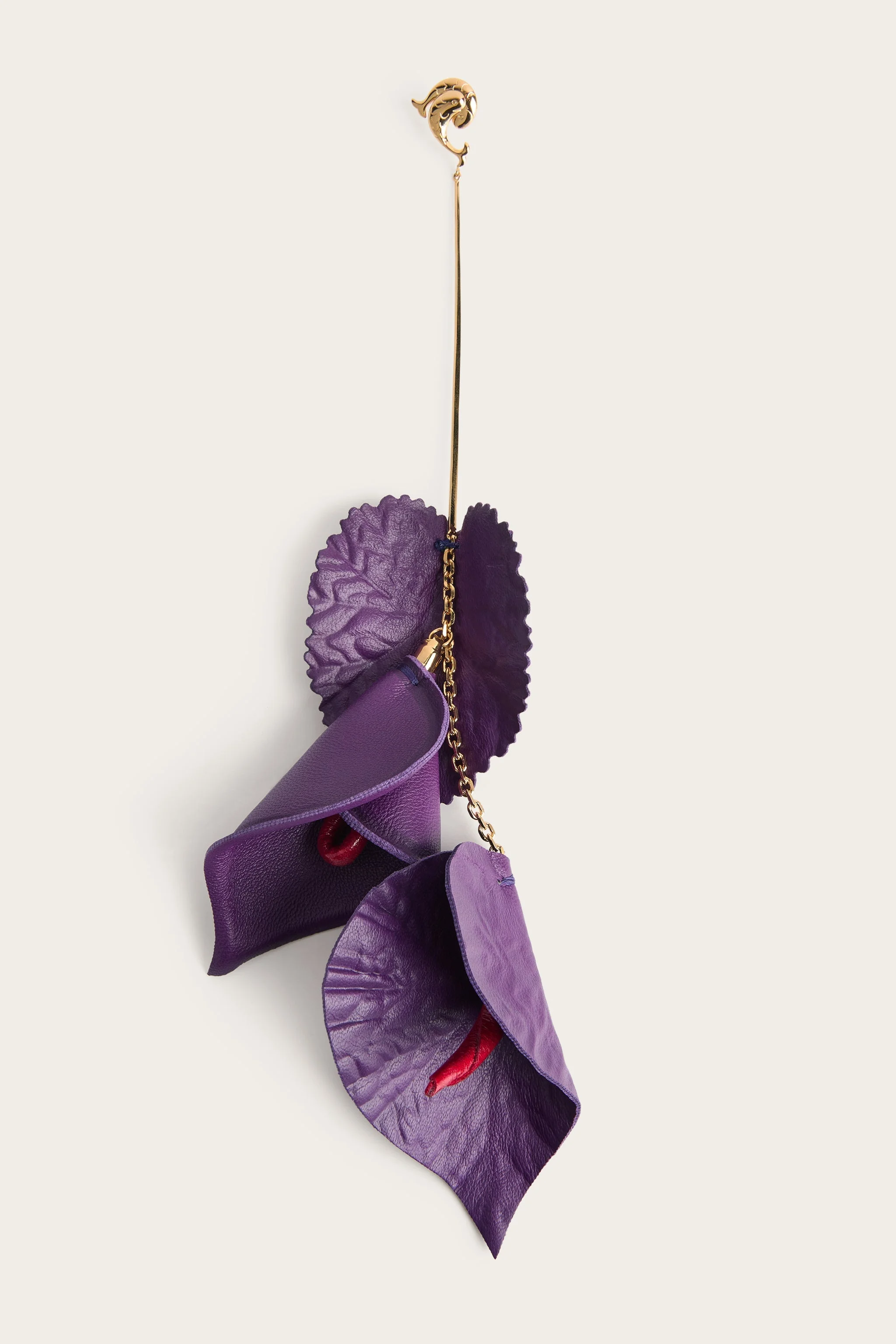 A dramatic piece of jewelry that encapsulates all of Pucci's creativity. This single pendant earring combines iconic and textural elements: the Pucci fish as a button, a central metal stick, and thin chains ending in three leather flowers with a light and playful movement. The shiny gold finish adds brightness and makes this piece perfect for completing an elegant look with an artistic and unexpected touch. - Black and Purple - Material: Brass - Polished gold finish - Mono earring pendant - Pucci fish like button - Chains with 3 leather flowers - Stiff metal center element - Not washable - Made in Italy - ID: 5UAL305U920N05