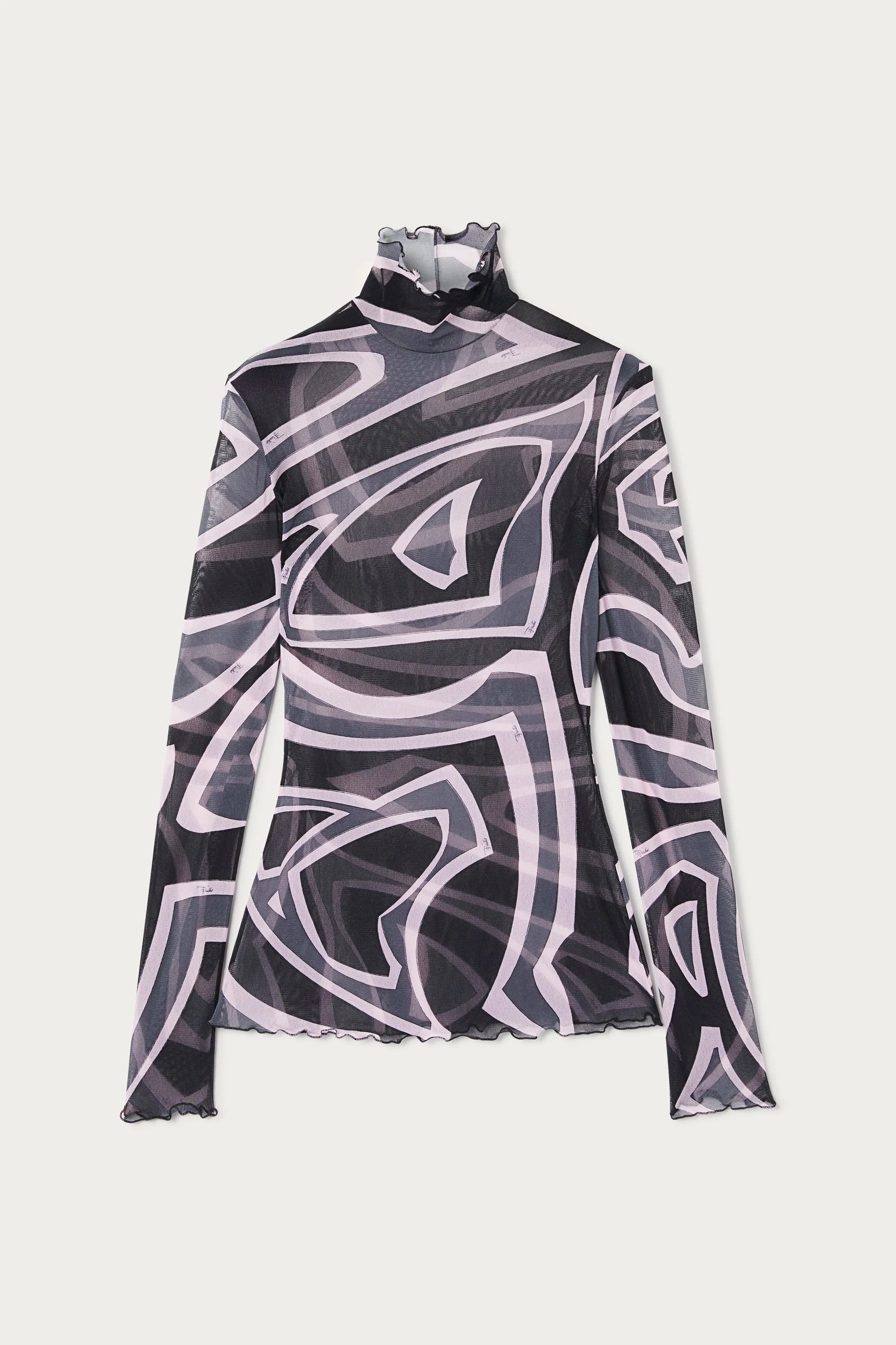 Bold transparencies and graphic lines define this lightweight, stretchy tulle top that wraps around you like a second skin. The long-sleeved design with a high neck enhances the silhouette with a contemporary and sophisticated allure. The Labirinto print, created in 1969, plays with the theme of disorientation and wonder, translating into a hypnotic pattern in shades of black and pink. - To offer you a unique Pucci garment, we use an all-over print that makes the product unrepeatable. Therefore, the pattern print may vary from the one displayed in the photo. - Black and Pink - Lightweight stretch tulle - 87% Polyamide, 13% Elastane - High neck - Long fitted sleeves - Slim fit - Soft, sheer fabric - Wash gently at max 30°C - Made in Italy - ID: 5UJM155U749047