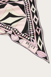 A timeless accessory that celebrates Pucci's distinctive elegance and creativity. This printed silk twill triangle, in the iconic Collane pattern in pink and black, is a true masterpiece of style. Its versatility makes it perfect for wearing in different ways: around the neck, as a hair band, or tied to a bag for a refined touch. The softness and lightness of the silk make it pleasant to wear, adding a touch of luxury to any outfit. - Pink and Black - Silk - Dimensions: 120x120 cm - Delicate dry clean only. - Made in Italy. - ID: 5UGB715UC191