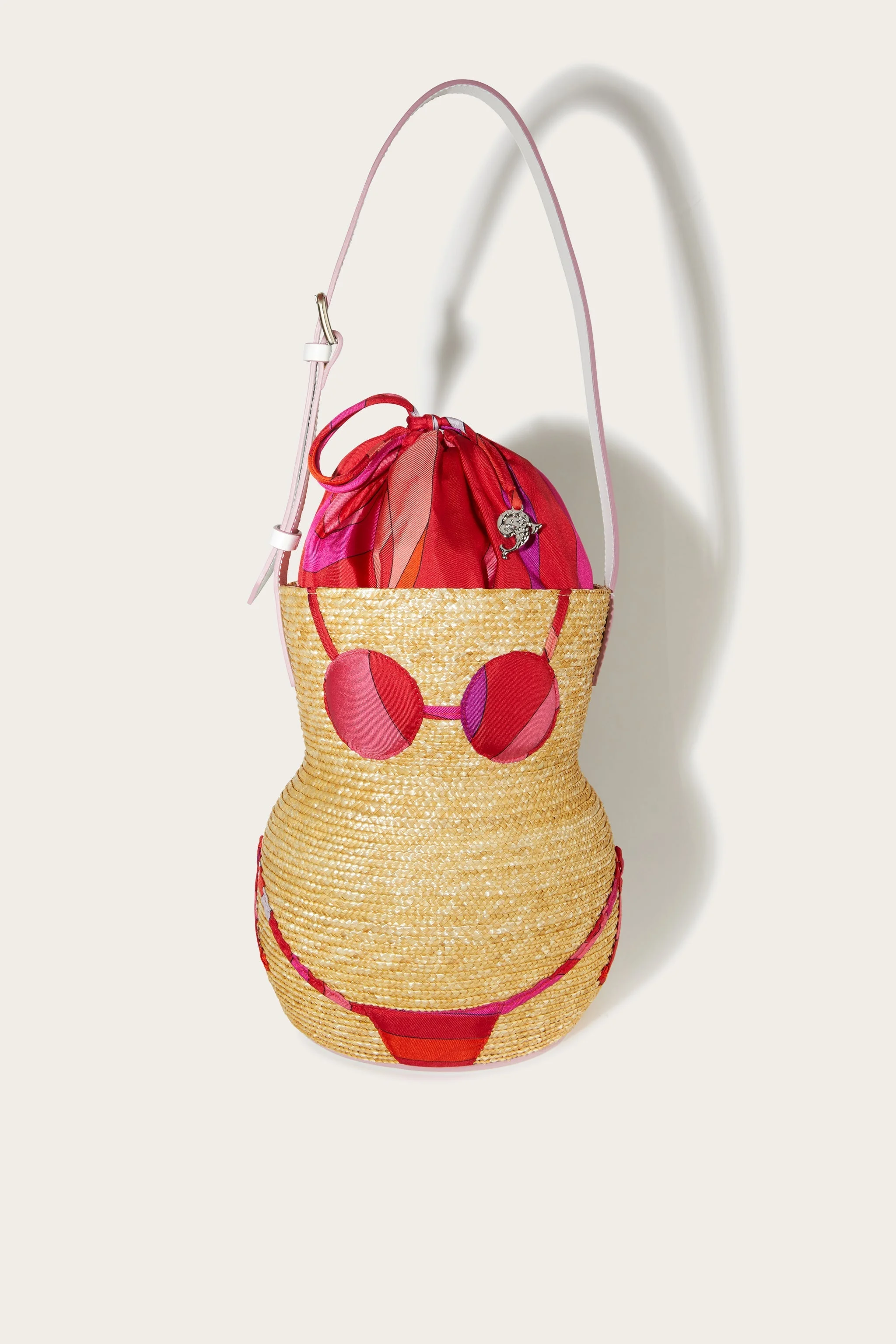 An icon of style and craftsmanship, the Puccinella bag reinterprets summer appeal with a mix of fine materials and exclusive details. The natural wheat braid shell is embellished with a printed silk twill drawstring that lends a touch of liveliness and sophistication, while the adjustable calfskin handle ensures practicality and versatility. Ideal for accompanying you on sunny days or giving a sophisticated twist to your city looks, it is embellished with details that celebrate Pucci's heritage: an enamel plaque and metallic Pesci-shaped charms. - Coral, fuchsia and natural - Materials: natural wheat braid, calfskin and printed silk twill - Enameled Pucci fish plaque and metal fish pendants - Contrasting edges - Adjustable handle with buckle and fish stamp on bottom - ID: 5HBA265H907A06