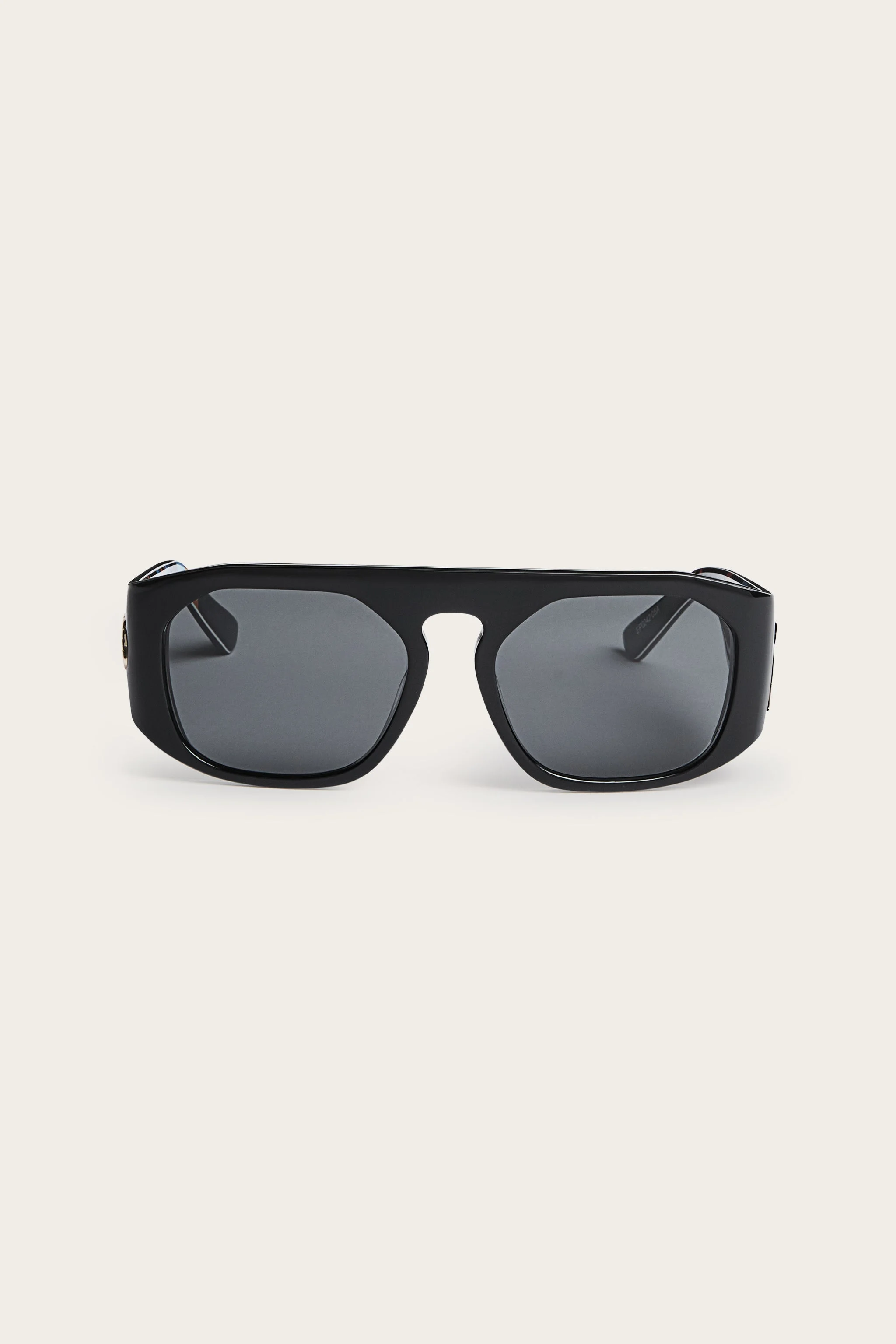 Bold minimalism and iconic details define these rectangular sunglasses. The black acetate frame is combined with temples printed on the inside in classic Pucci style, while the gold fish logo adds a precious and recognizable touch. Dark gray lenses complete an accessory that blends functionality and graphic character. - Black and Smoke - Acetate frame with printed temples - Dark gray lenses - Gold fish logo - Size: 54 - Made in Italy - ID: EP0242P005405A