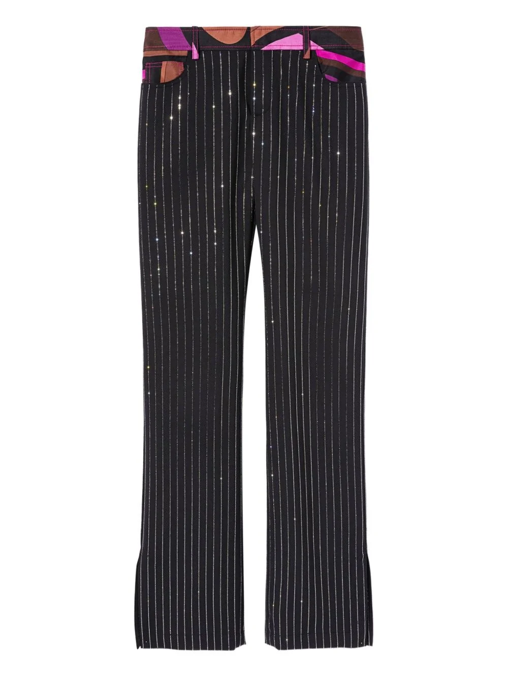 rhinestone-embellished pinstripe trousers Highlights - Black - Pinstripe pattern - Rhinestone embellishment - High waist - Side splits Made in Italy Composition Outer: Virgin Wool 95%, Elastane 5% Lining: Acetate 67%, Polyester 33% Washing instructions Dry Clean Only