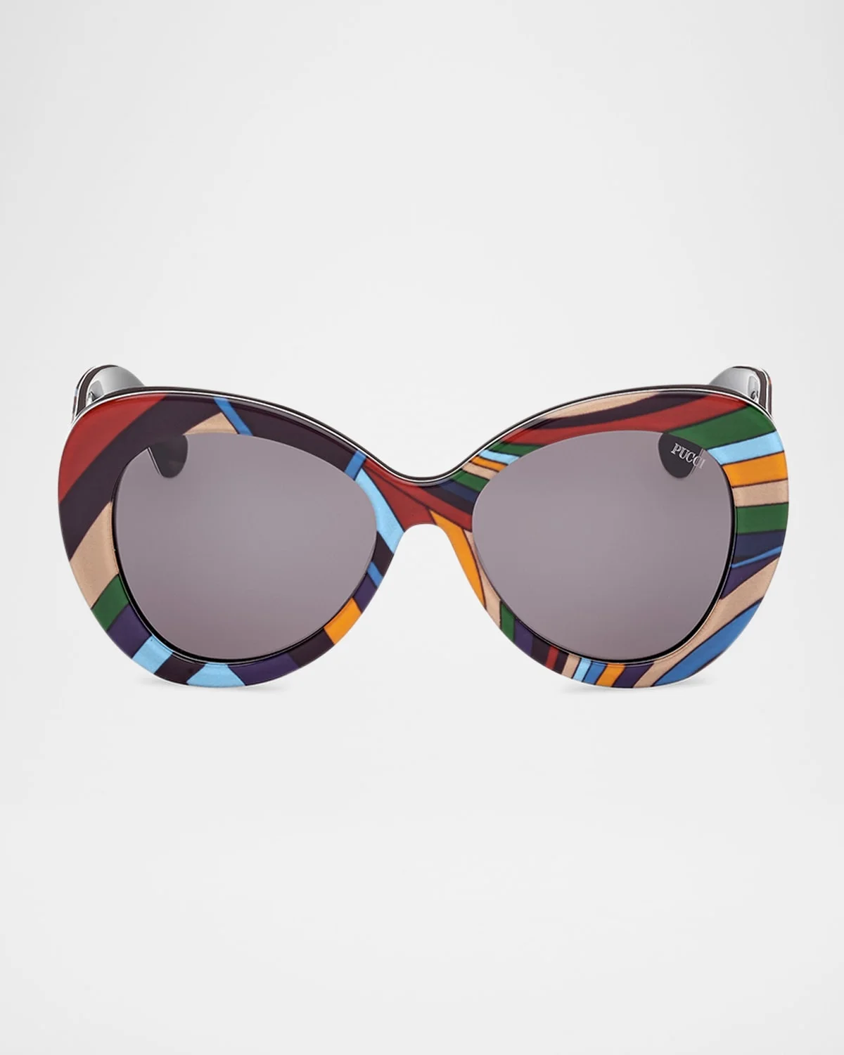 - Emilio Pucci round sunglasses in acetate - Eye/bridge/temple (in mm): 56-18-140 - Solid-color lenses - Saddle nose bridge - Thick, tapered arms - Logo at lens - Acetate - Spot clean - 100% UVA/UVB protection - Made in Italy - Proposition 65 warning for California residents