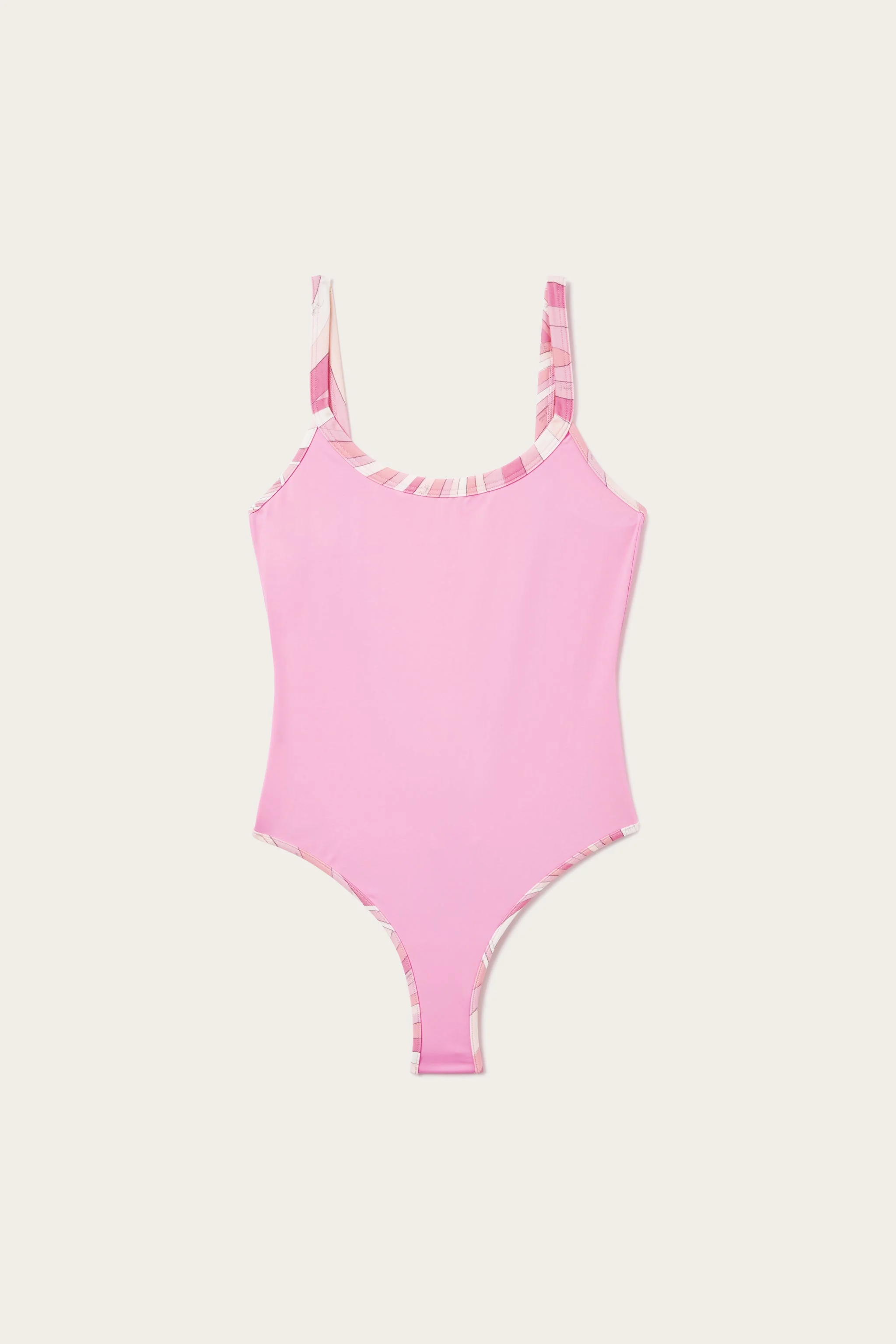 An essential elegance that enhances the silhouette with clean, sophisticated lines. This one-piece swimsuit features a round neckline and thin straps, elements that give a refined and feminine look. Made of stretch lycra with anti-UV treatment, it offers a snug and comfortable fit, adapting to the body with a perfect combination of support and lightness. The Pink Panther color adds a lively and contemporary touch, perfect for those who like to stand out in style even at the seaside. - Pink Panther - Stretchy Lycra with anti-UV treatment - Main fabric: 82% Polyamide, 18% Elastane - Secondary fabric: 80% Polyamide, 20% Elastane - Round neckline - Thin shoulder straps - Wrap-around comfortable fit - Hand wash. - Made in Italy. - ID: 5HMC055H645H46 - Model is 178 cm tall and wears Italian size 38.