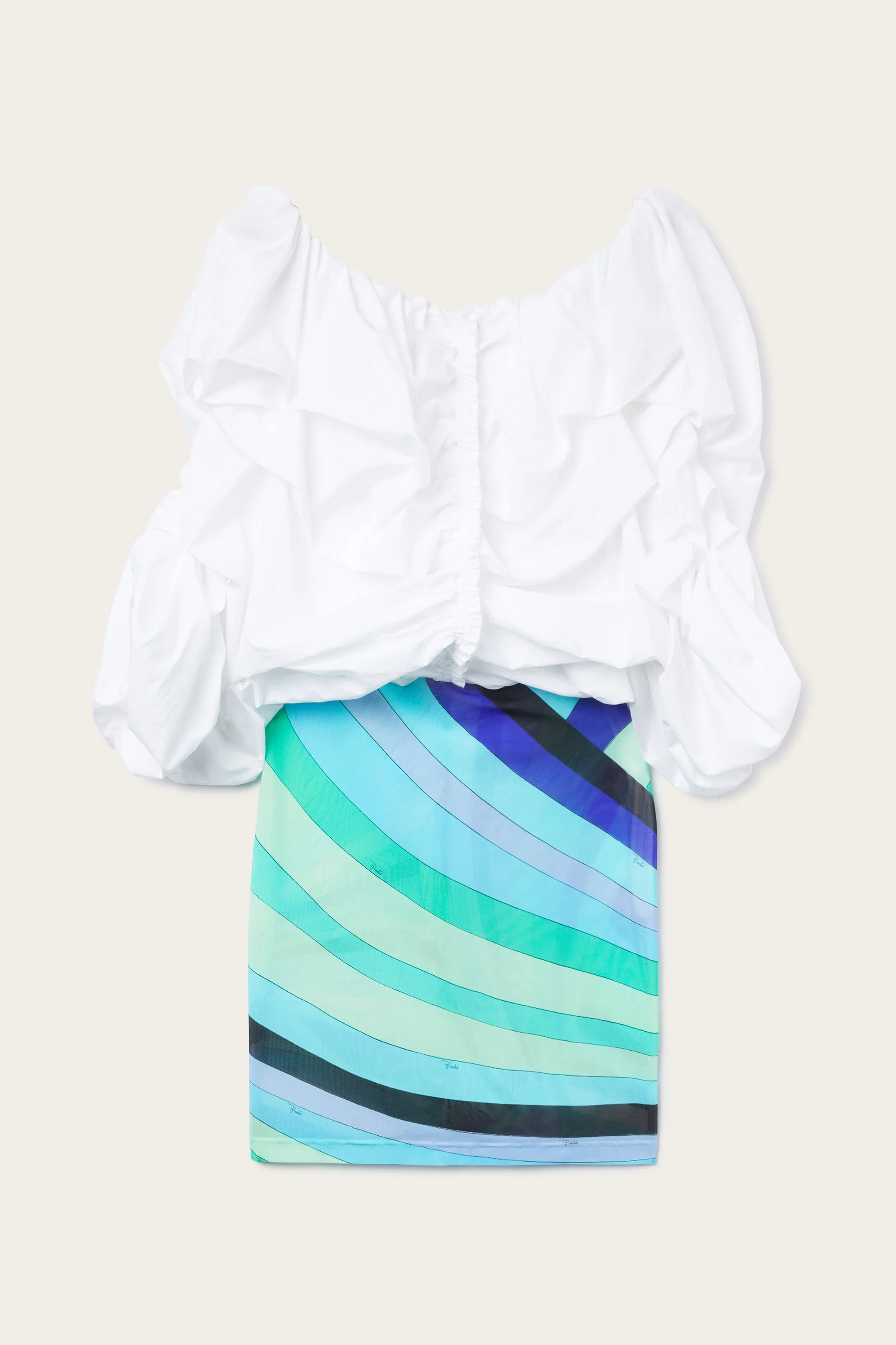 A perfect balance between volume and silhouette. This sleeveless mini dress plays with contrasts: the top, made of lightweight cotton poplin, gently wraps the bust and arms with fluffy details, leaving the shoulders bare for a touch of sophisticated femininity.The fitted skirt, made of a stretchy, semi-transparent fabric, creates a sharp contrast with the voluminous top, enhancing the silhouette with elegance. The combination of white for the top and print for the bottom adds dynamism and modernity to this garment designed for those who love to play with proportions. - To offer you a unique Pucci garment, we use an all-over print that makes the product unrepeatable. Therefore, the pattern print may vary from the one displayed in the photo. - White - Upper part: 100% Cotton - Bottom part: 84% Polyamide, 16% Elastane - Uncovered shoulders with fluffy details - Hand wash. - Made in Italy. - Model is 177 cm tall and wears Italian size 38. - ID: 5HRG315H603100