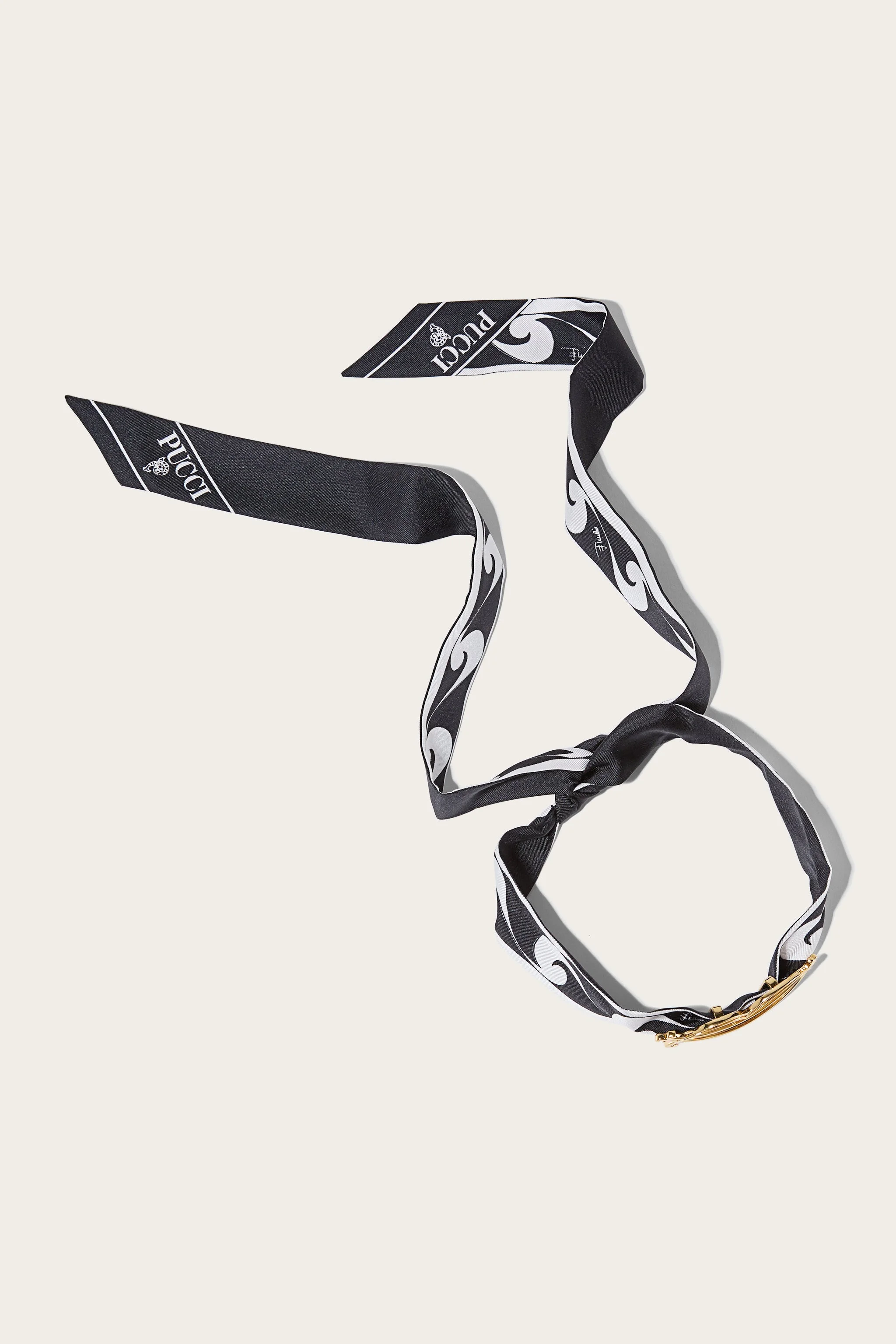 An accessory that combines the elegance of the scarf with the sensuality of the jeweled detail. This silk choker is worn like a collar and gently wraps around the neck, giving the look a sophisticated and light touch.The shining detail? The golden brass charm in the shape of lips, one of the most iconic elements of the Pucci universe. A harmonious mix of fabric and metal, designed for those who love unique and playful details. - Gold - Main material: Brass - Details: Silk - Central lip-shaped charm - Made in Italy - ID: 5HAM405H283N50