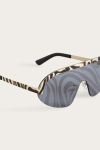 Futuristic and unmistakable, these wrap-around sunglasses express Pucci style with a bold, contemporary design. The Marmo motif, one of the brand's most iconic, starts from the edge of the frame and elegantly extends along the metal temples until it merges with the smoked mirrored lenses, for a graphic and fluid effect that catches the eye.A bold model that reinterprets the sports mask with a couture touch, designed for those looking for accessories with a strong visual impact. - Black and smoke mirror - Metal - Mask frame - Marmo motif on frame, temples and lenses - Smoked mirrored lenses - Metal temples - Shaped temples - ID: EP0237M000005C