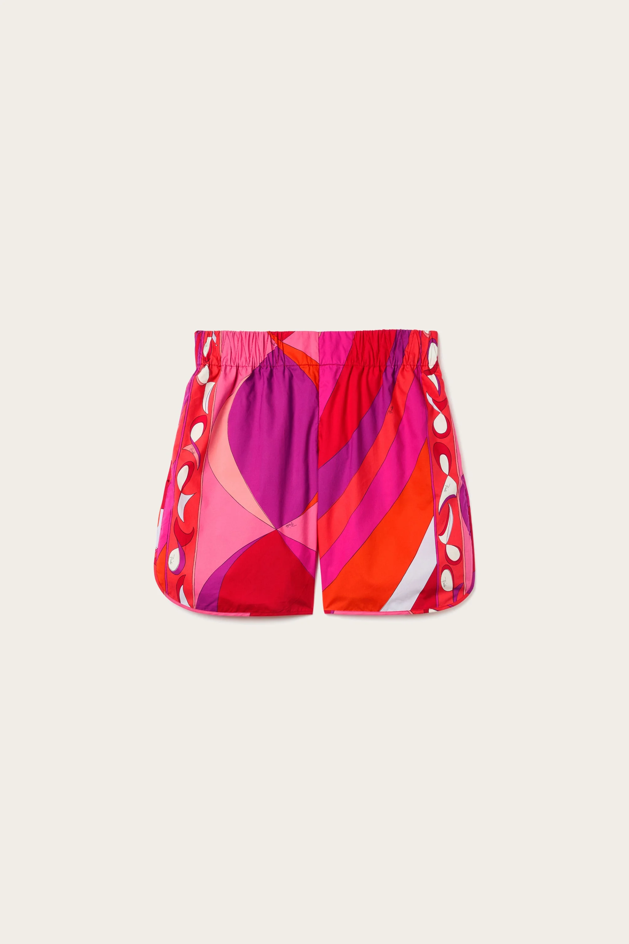 A blend of comfort and essential style. These boxy-fit shorts offer a relaxed, structured fit perfect for those who love versatile garments with distinctive character. The design is complemented by a ribbed waist and hem, providing a comfortable and defined fit.The Pesci print in coral and fuchsia adds a fresh and feminine touch, turning a casual garment into a style icon with timeless appeal. - To offer you a unique Pucci garment, we use an all-over print that makes the product unrepeatable. Therefore, the pattern print may vary from the one displayed in the photo. - Coral and fuchsia - 100% Cotton - Squared fit - Ribbed waist and hem - Wash gently max 30°C. - Made in Italy. - ID: 5HRU315H789017 - The model is 177 cm tall and wears Italian size 38.